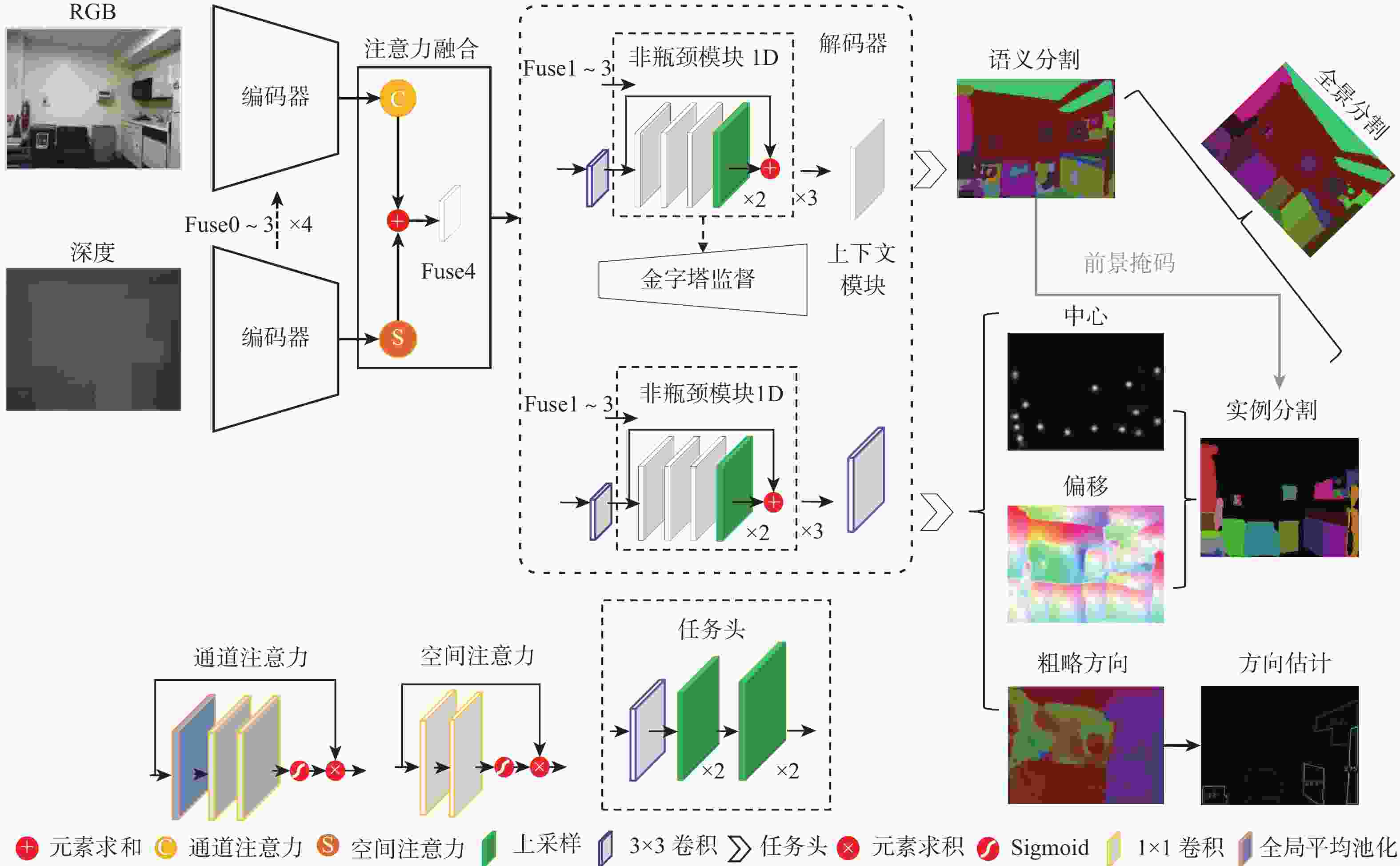 % 方法 融合方式 上下文位置 实例分割 全景分割 语义分割 PQ MAAE mIoU PQ RQ SQ MAAE mIoU 基准 2×SENet[8] 解码器前 60.99 17.59* 49.31 42.30 50.73 82.32* 16.83 50.16 方法1 2×CBAM[9] 解码器前 60.71 17.71 50.27 42.70 51.30 82.17 15.79* 50.35 方法2 2×NonLocal[10] 解码器前 61.75* 18.08 50.52* 42.98 51.75* 82.13 16.07 50.61* 方法3 SENet/Excite 解码器前 61.42 17.95 49.68 43.41* 51.39 82.21 15.94 49.97 方法4 2×SENet[8] 解码器后 61.61 18.33 49.19 42.79 51.48 82.68 16.10 49.76 方法5 2×NonLocal[10] 解码器后 61.02 19.11 48.42 41.85 50.19 82.31 16.52 48.45 本文方法 SENet/Excite 解码器后 61.88 18.45 49.36 43.54 52.08 82.60 15.76 49.75 注:“*”标志的数据表示注意力消融实验的最佳结果;SENet表示通道注意力模块,Excite表示空间注意力模块。 表 3 在NYUv2数据集中验证不同任务的组合效果
