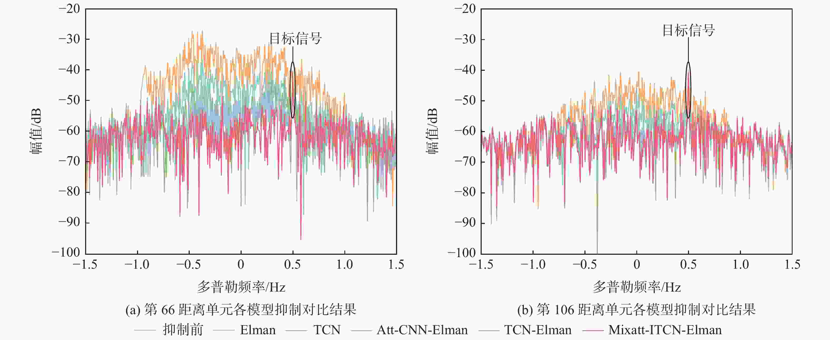 模型 信杂比/dB 66距离单元 86距离单元 106距离单元 原始 −2.96 1.14 9.27 Elman 5.82 10.22 17.65 TCN 11.30 19.21 25.19 Att-CNN-Elman 12.53 17.15 24.72 TCN-Elman 12.58 19.70 24.83 Mixatt-ITCN-Elman 15.55 25.81 30.51 -