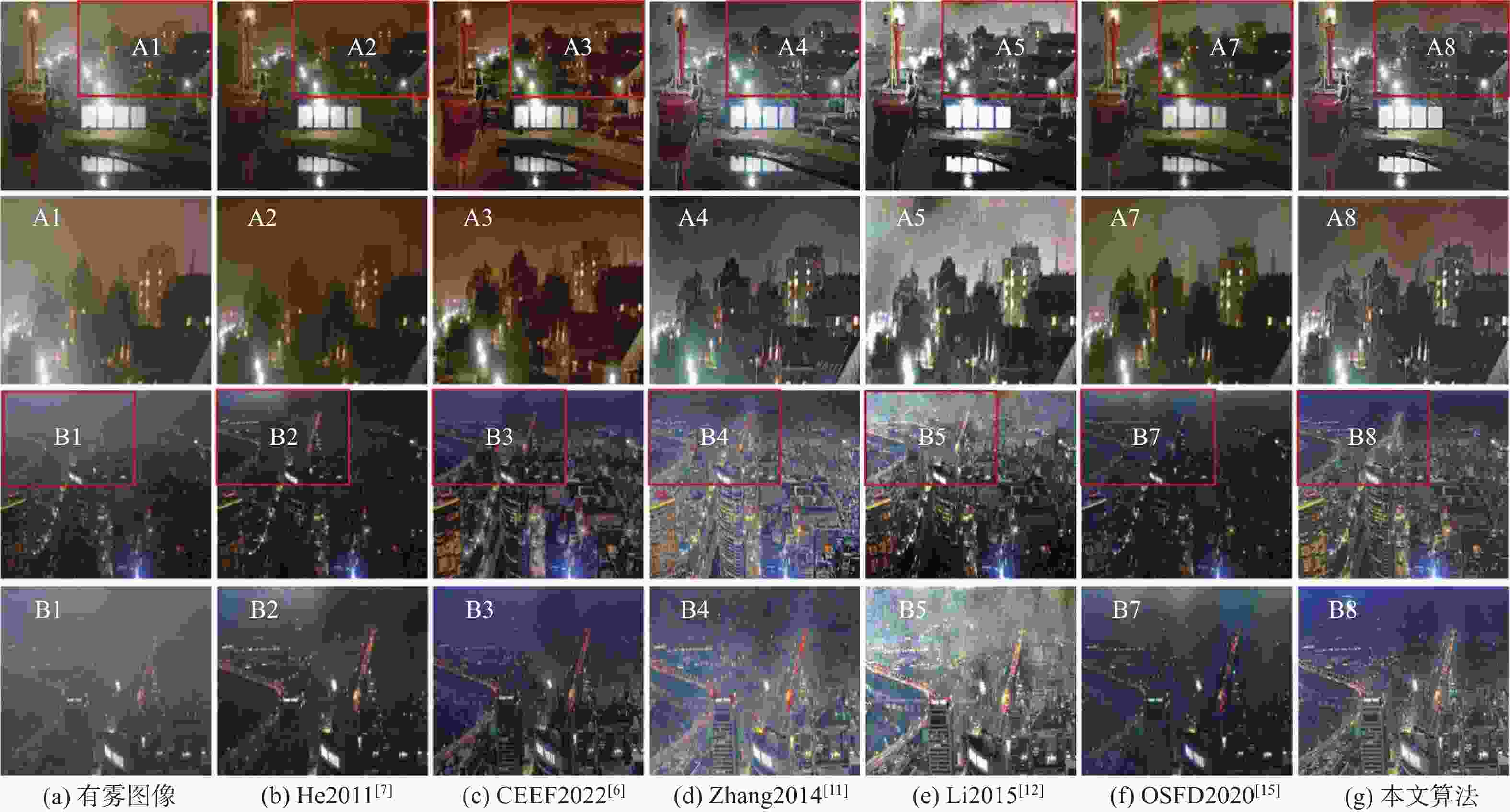 算法 色差值 色差值均值 黄色 白色 褐色 红色 蓝色 绿色 He2011[7] 10.384 14.362 12.356 13.031 33.204 19.878 17.203 Zhang2014[11] 8.543 11.497 10.409 24.261 30.797 12.618 16.354 Li2015[12] 6.604 4.915 16.213 9.109 32.103 9.080 13.004 OSFD2020[15] 3.800 3.637 12.518 13.427 40.042 11.388 14.135 CEEF2022[6] 26.813 26.068 15.886 9.713 40.018 31.475 24.996 本文算法 1.955 2.321 9.936 10.780 31.684 9.297 10.996 表 2 人工合成夜间有雾图像数据集SSIM和PSNR均值