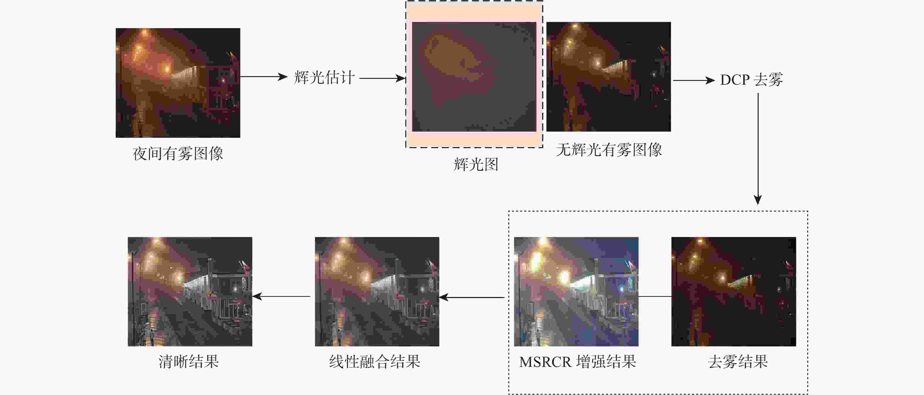 Abstract:To address the problems of low brightness, glow, and color distortion caused by artificial light sources in nighttime hazy images, this paper proposed a nighttime image dehazing algorithm based on a non-uniform atmospheric light correction model. Firstly, according to the imaging characteristics of non-uniform atmospheric light, the traditional atmospheric scattering model was modified by adding surface illumination light and glow terms. Secondly, the near-light source coefficient was determined based on image intensity and saturation components, and the glow term was accurately estimated to correct the non-uniform atmospheric light. Then, based on the dark channel prior (DCP) and multi-scale Retinex enhancement algorithm with color restoration ability, the study adopted guided filtering to solve the block effect of transmittance and the linear fusion to solve the problem of excessive enhancement. Finally, Gaussian high-pass filter was used for enhancing the details of the image to obtain the final clear image. The experimental results show that nighttime hazy images restored by the proposed algorithm have natural color, rich details, and high visibility. Compared to classical algorithms such as dark channel prior, as well as novel algorithms like contrast enhancement and exposure fusion (CEEF), the proposed algorithm reduces the color difference by about 15%, improves the peak signal-to-noise ratio by about 15%, and enhances the average gradient by about 8%, having more advantages in qualitative and quantitative experiments.