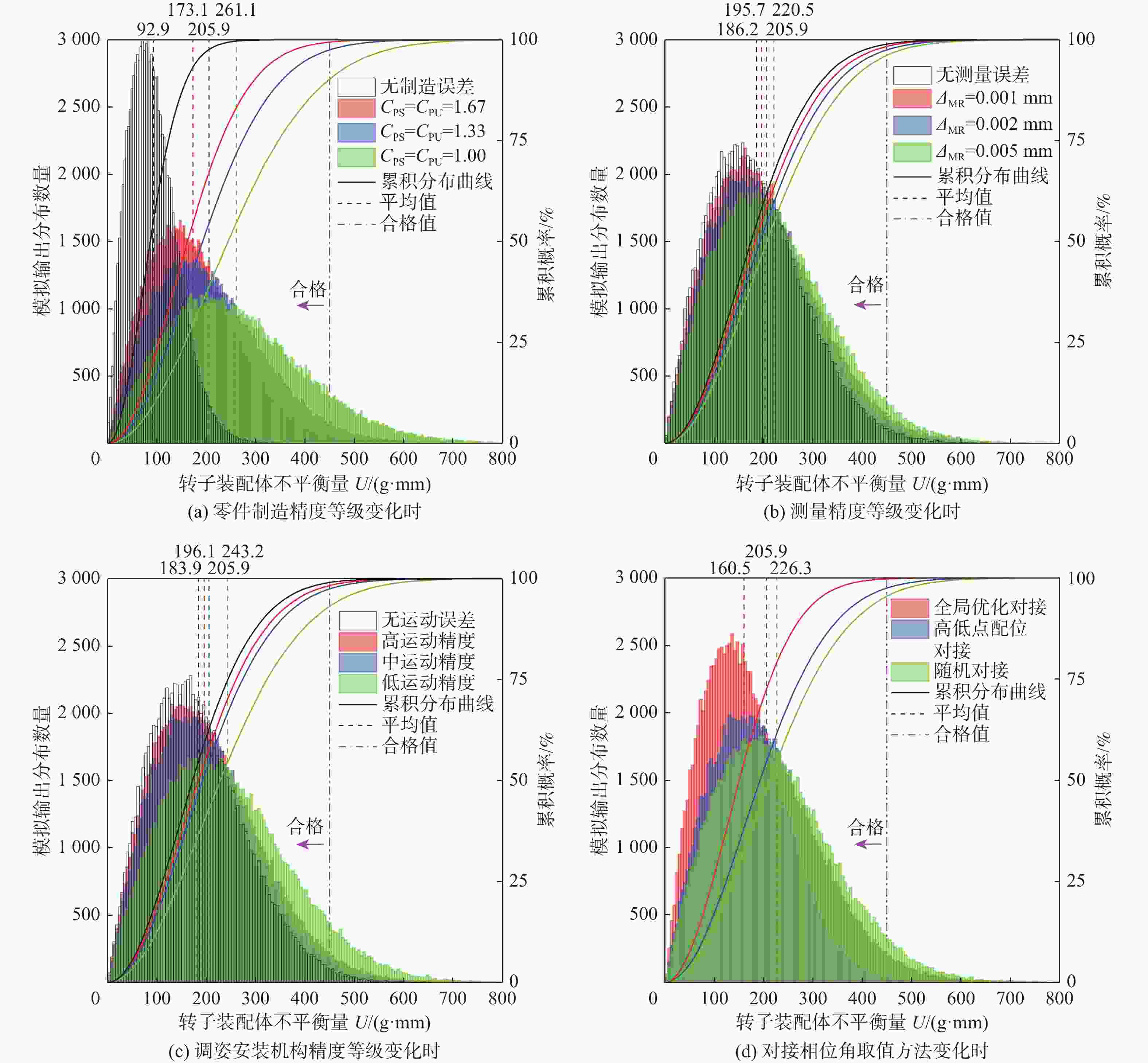 转子零件 不平衡量设计上限/ (g·mm) 对应矩阵元素及其分布 后轴 100 U1服从 N+[0,(33.3/CPU)2] 锥形盘 250 U2服从 N+[0,(83.3/CPU)2] 低压涡轮轴 500 U3服从 N+[0,(166.7/CPU)2] 表 3 装配系统中各关联精度的敏感度系数