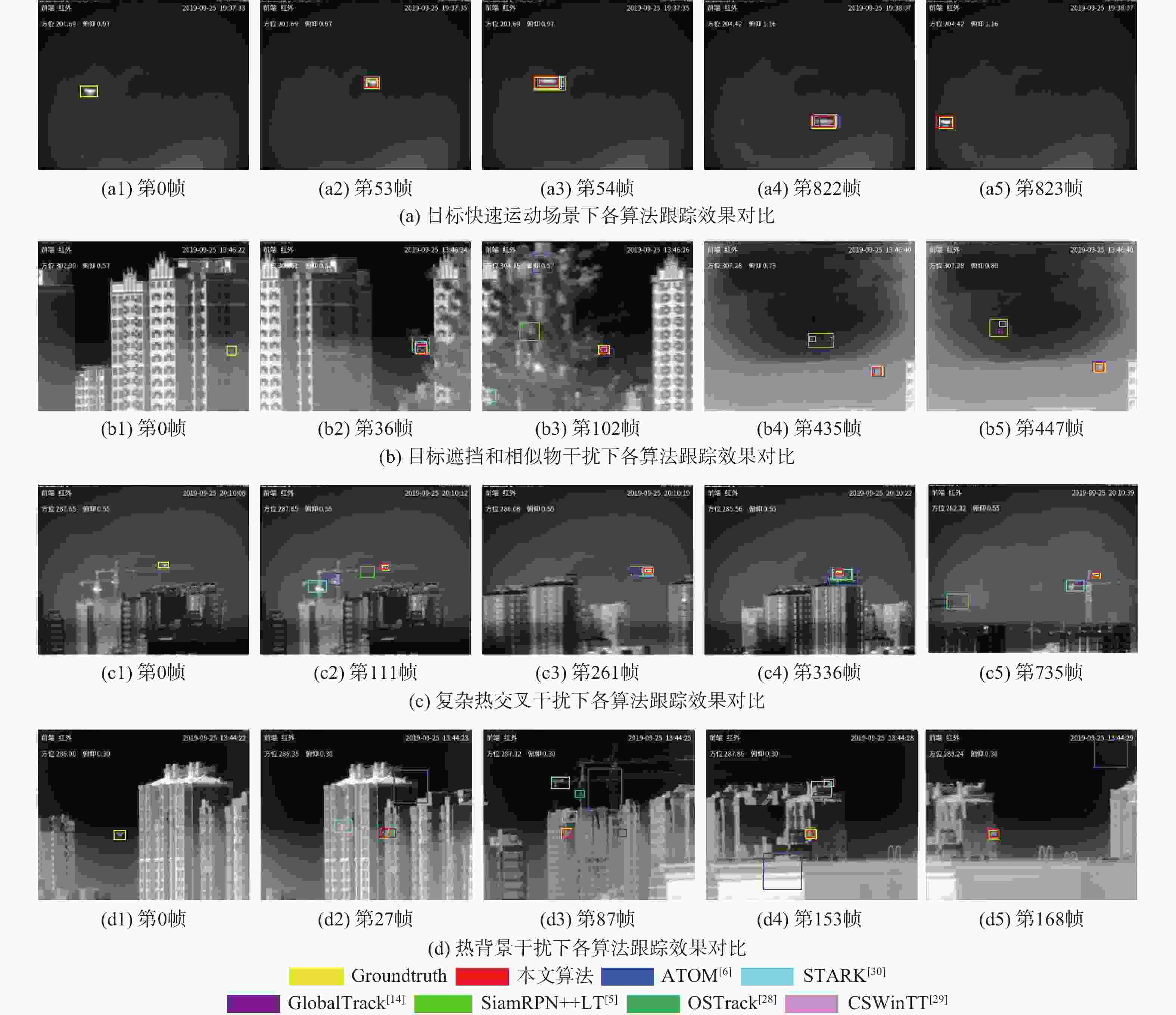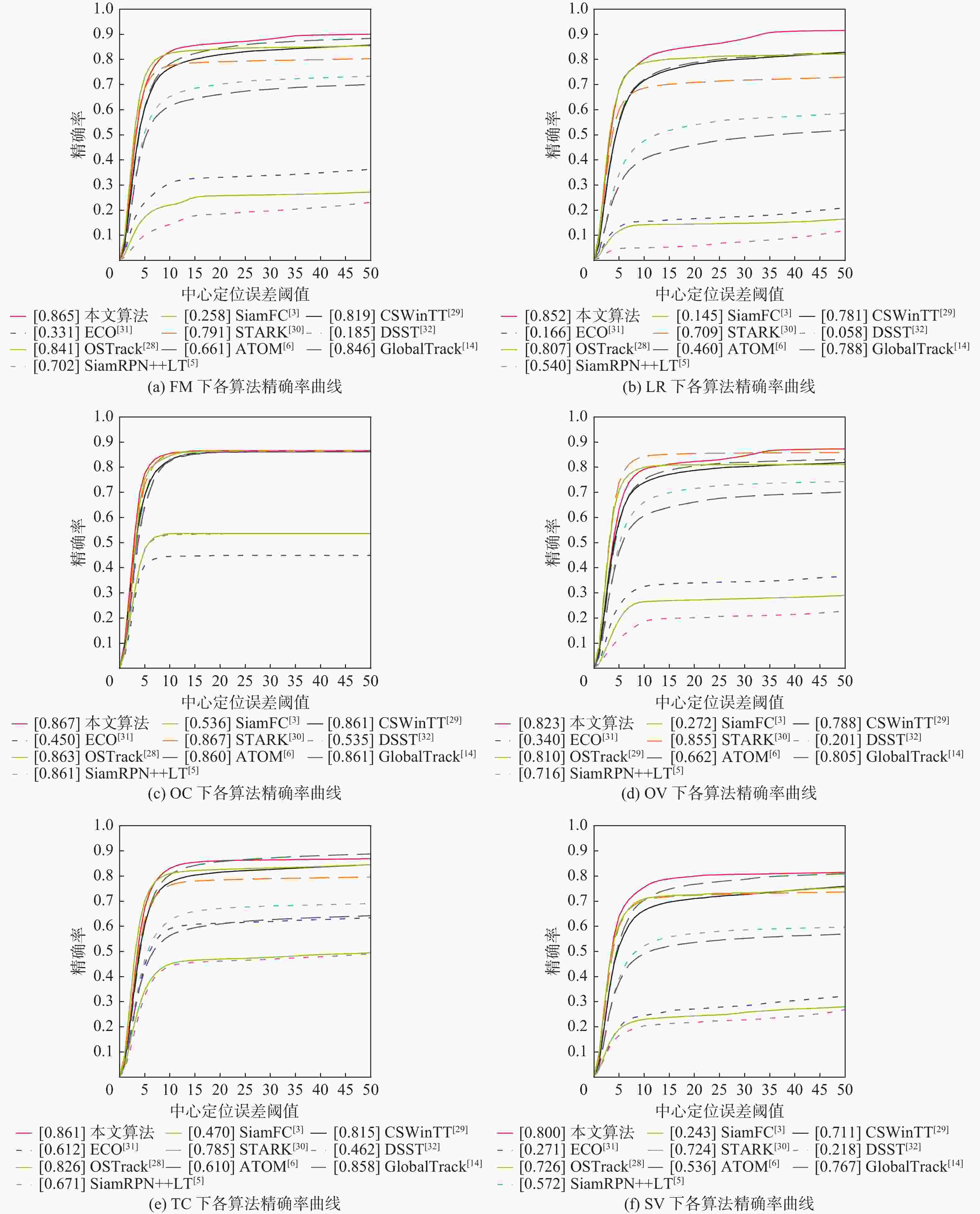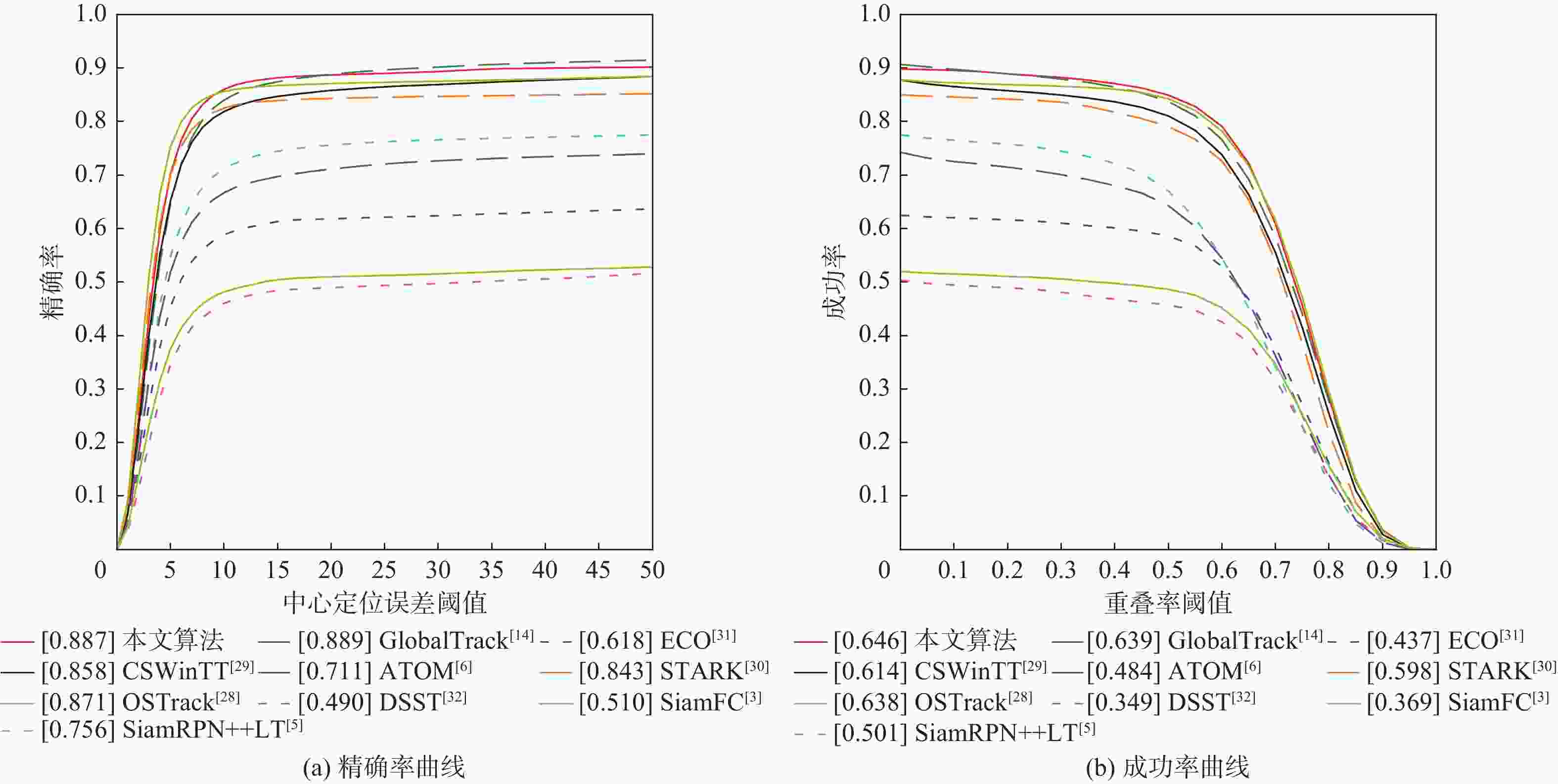算法 精确率 成功率 平均准确度 运行速率/(帧·s−1) DSST[32] 0.490 0.349 0.354 31.2 SiamFC[3] 0.510 0.369 0.375 60.2 ECO[31] 0.618 0.437 0.444 7.5 ATOM[6] 0.711 0.484 0.490 28.7 SiamRPN++LT[5] 0.756 0.501 0.507 26.3 STARK[30] 0.843 0.588 0.607 33.5 CSWinTT[29] 0.858 0.614 0.623 8.5 OSTrack[28] 0.871 0.638 0.647 22.6 GlobalTrack[14] 0.889 0.639 0.648 10.2 本文算法 0.887 0.646 0.656 18.5 表 2 模型组件性能对比