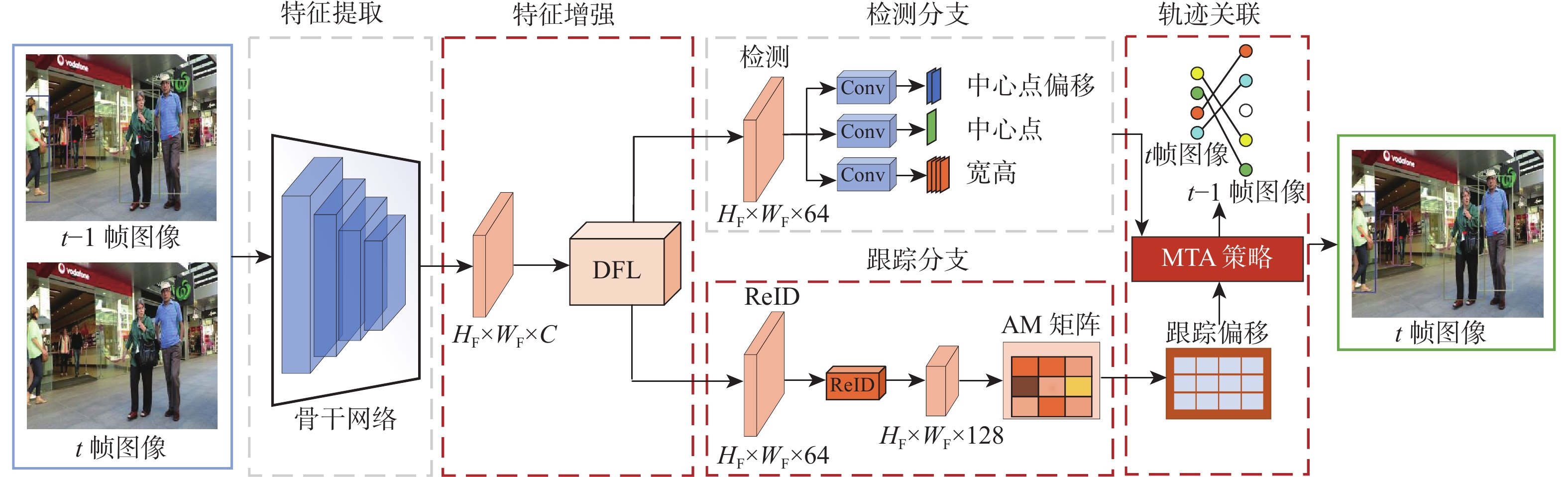 在多目标跟踪(MOT)算法中,经常出现目标特征提取不足、身份切换及轨迹缺失问题,降低跟踪性能。为解决以上问题,提出一种基于双分支特征增强和多级轨迹关联(MTA)的MOT算法。采用双分支特征学习网络对检测和跟踪2种任务的特殊性和相关性进行学习,缓解了两任务之间的过度竞争,提取到充足的目标特征信息;引入关联矩阵(AM),利用更多的时序信息预测偏移向量,减少身份切换次数;采用多级轨迹关联策略,保留一部分低分检测框,并将检测框重新划分为高分框和低分框,采用不同的匹配方式与轨迹进行关联,减少轨迹缺失次数。在典型多目标跟踪数据集MOT17和MOT20上,对JDE、CenterTrack等6种相关算法进行对比实验。实验结果表明:所提算法在MOT17数据集上的多目标跟踪准确度(MOTA)和身份