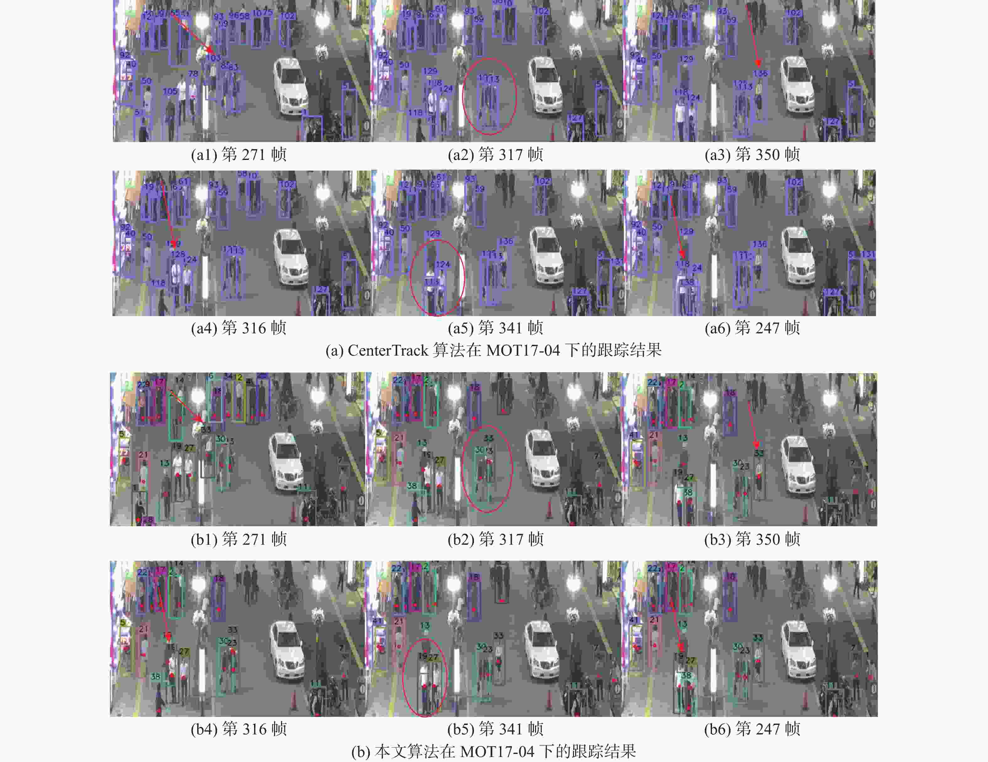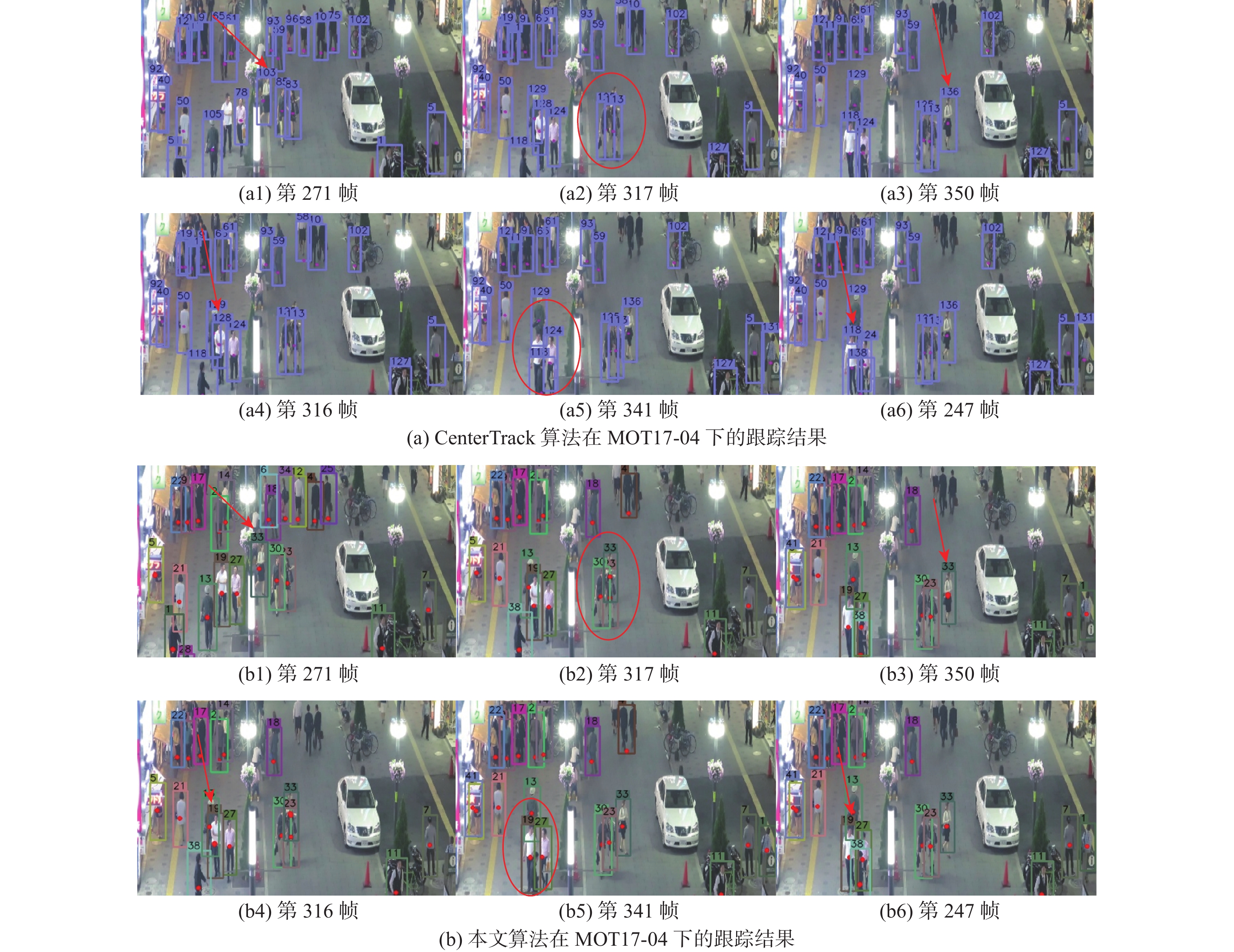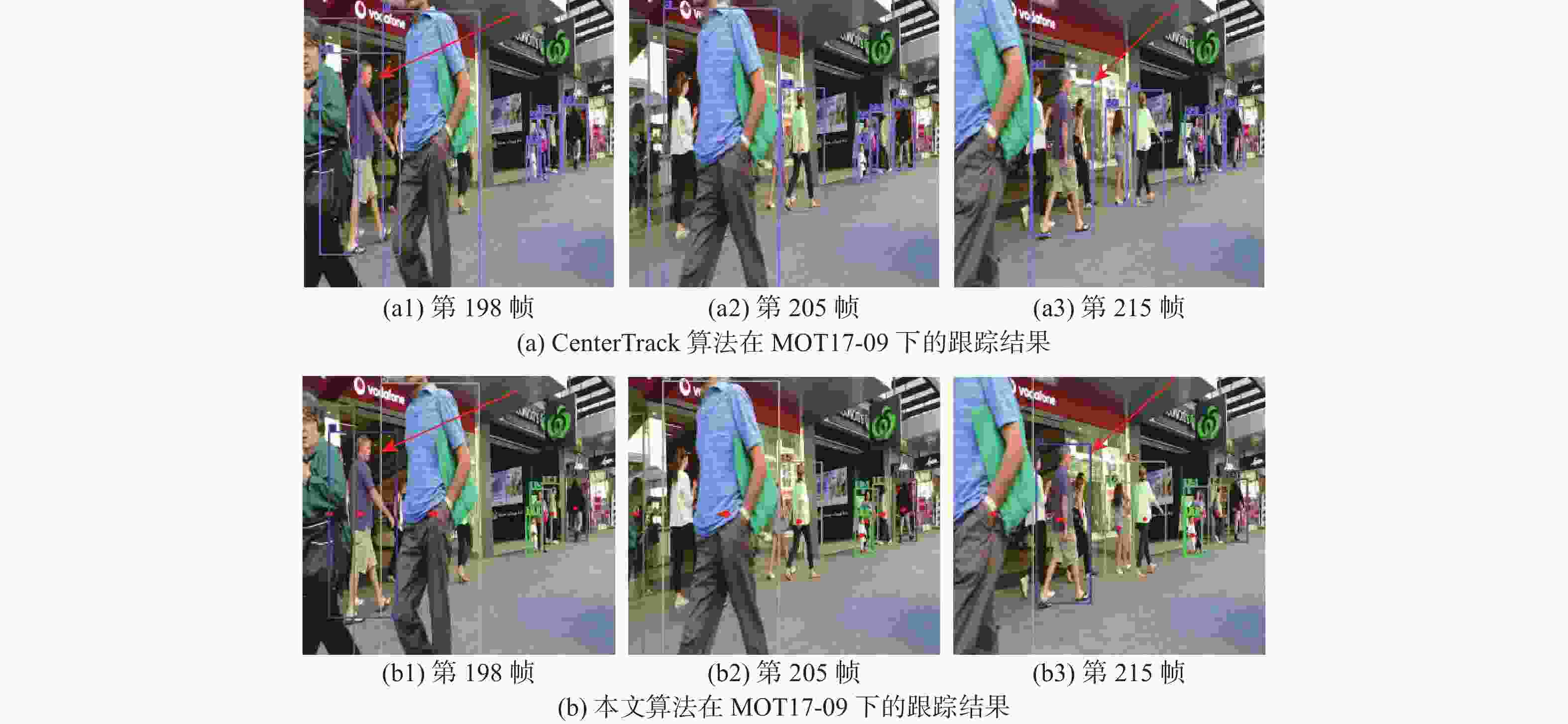 F 1 score (IDF1) values on MOT17 and MOT20 are 68.2% and 68.5%, respectively, 2.1% and 4.3% higher than those of the benchmark algorithm CenterTrack. On MOT20, the MOTA and IDF1 values are 52.7% and 48.2%, respectively, 1.4% and 7.9% higher. The algorithm solves the identity switching problem better and achieves excellent tracking performance in complex scenarios. -