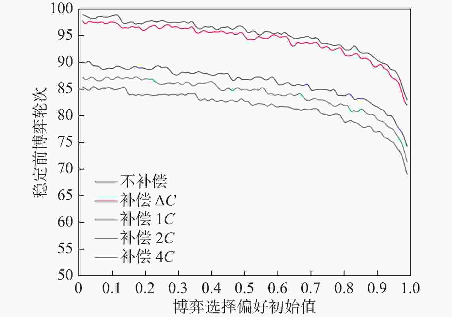 $ ({p_0},{q_0}) $ 正常博弈者所需轮次 激进博弈者所需轮次 激进较正常博弈者的变化比例/% 保守博弈者所需轮次 保守较正常博弈者的变化比例/% (0.01,0.01) 113.95 81.59 −28.39 160.04 40.44 (0.10,0.10) 18.85 13.48 −28.48 28.01 48.59 (0.20,0.20) 13.25 10.29 −22.34 18.91 42.71 (0.30,0.30) 10.34 7.64 −26.11 16.09 55.60 (0.40,0.40) 8.50 7.41 −12.82 11.72 37.88 (0.50,0.50) 7.74 5.79 −25.19 9.64 24.54 (0.60,0.60) 7.46 5.28 −29.22 8.98 20.37 (0.70,0.70) 5.98 5.01 −16.38 7.88 31.77 (0.80,0.80) 5.23 4.04 −22.75 6.83 30.59 (0.90,0.90) 5.08 3.59 −29.33 5.96 17.32 (0.99,0.99) 3.62 3.29 −9.12 4.21 16.29 表 4 不合作博弈者在不同初始状态所需博弈轮次