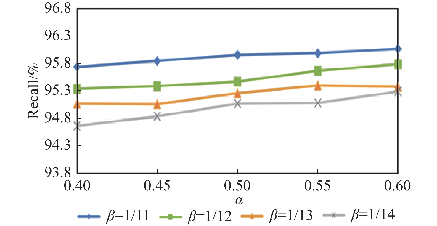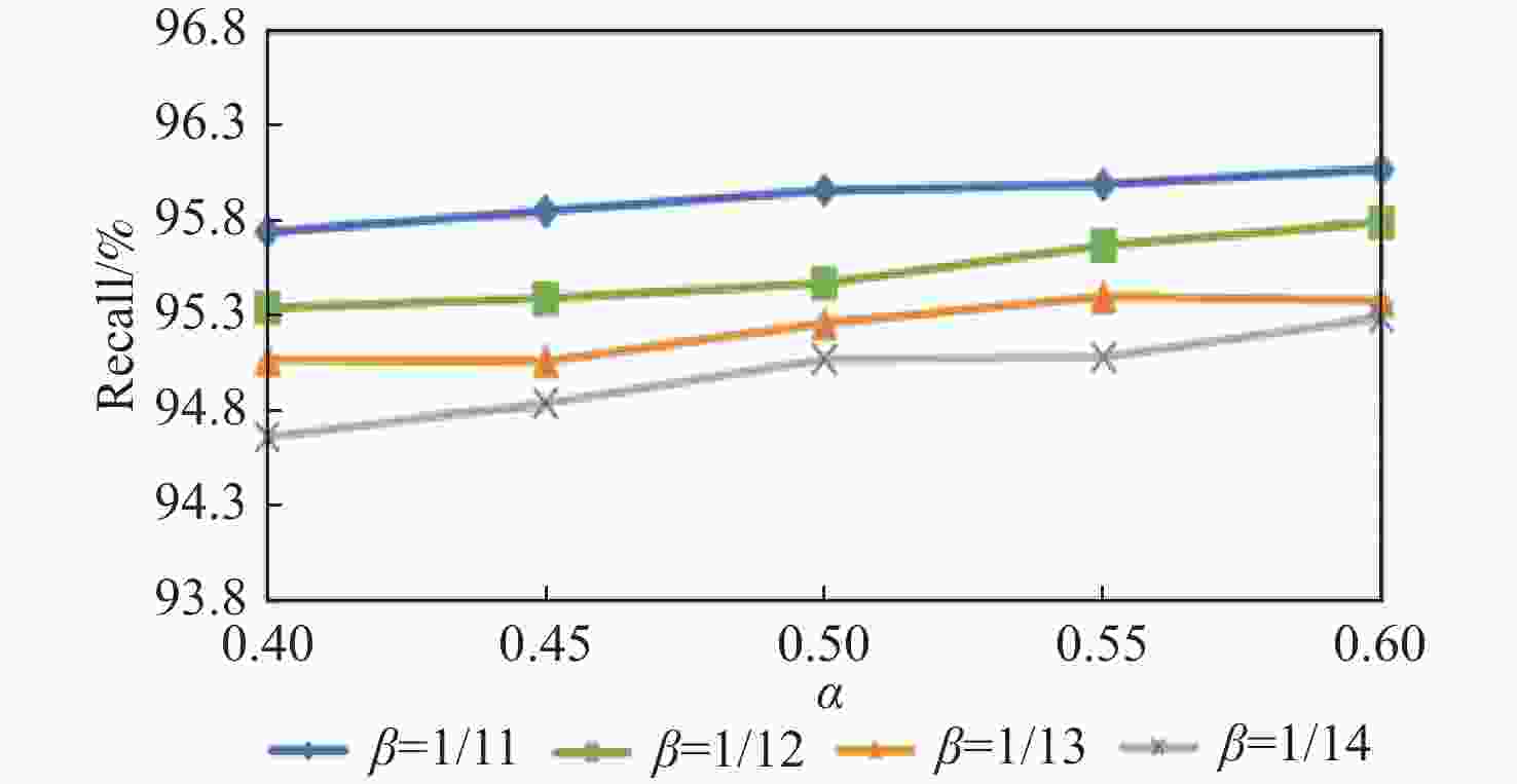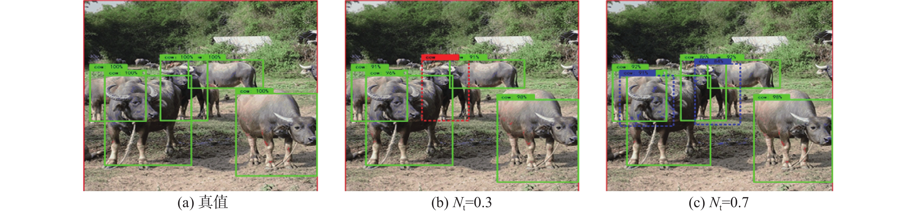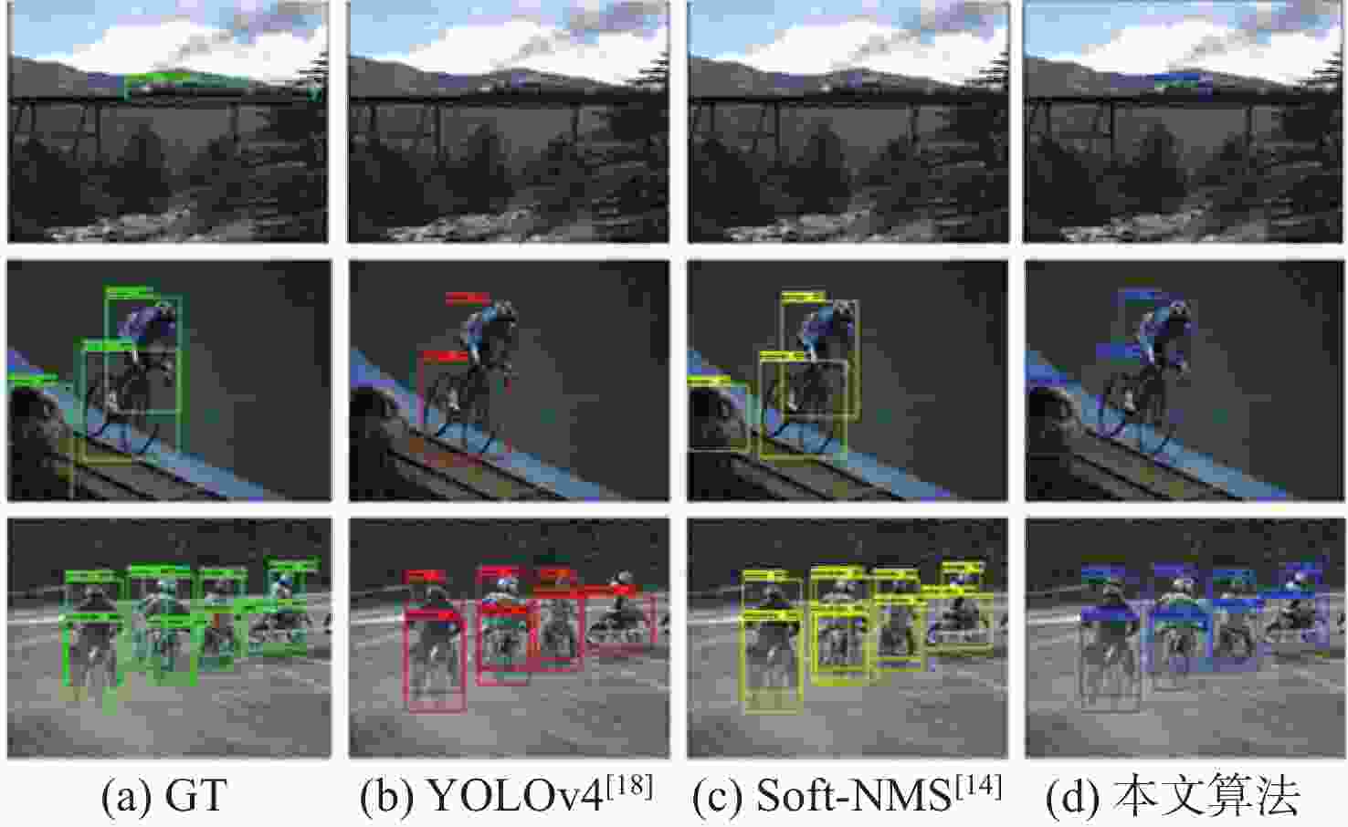 基准算法 阈值 ASPP AMCM mAP/% Recall/% MR−2/% YOLOv4 ${N_{\mathrm{t}}} = 0.5$ 81.8 89.5 23.4 √ 82.9 90.4 22.8 √ 83.2 91.0 22.3 表 3 ADT-NMS在PASCAL VOC上的有效性分析