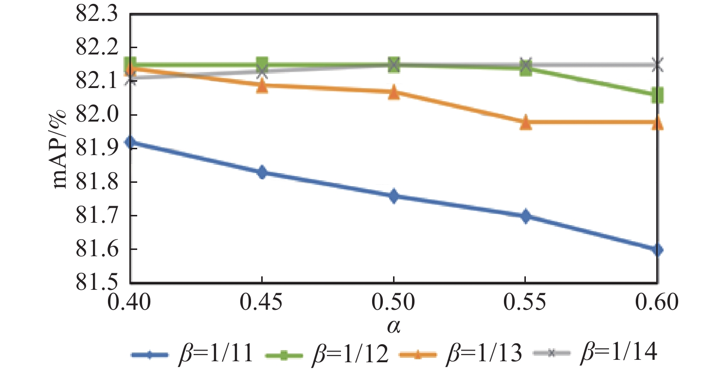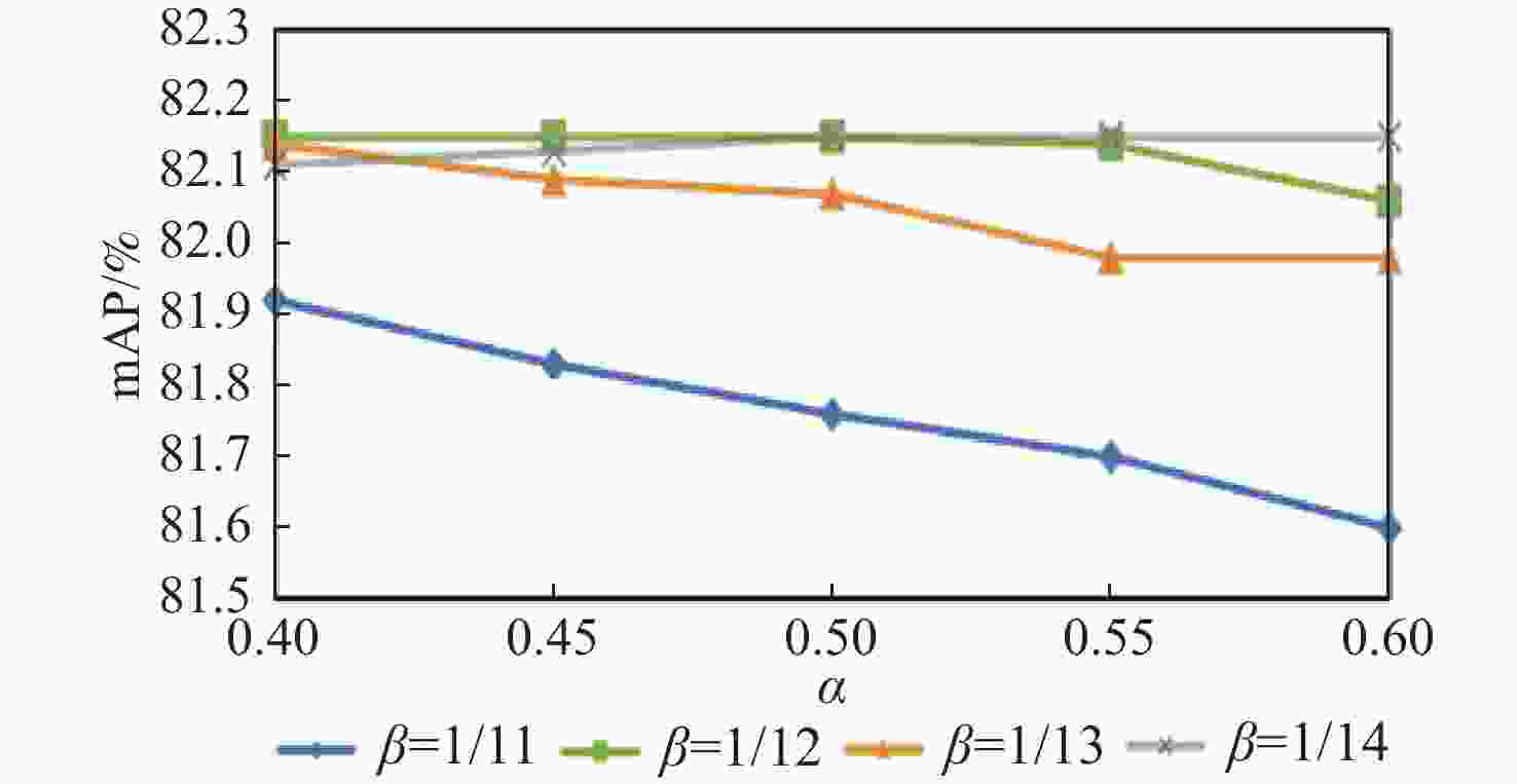 Baseline algorithm AMCM ADT-NMS 阈值 mAP/% Recall/% MR−2/% YOLOv4 $ {N_{\mathrm{t}}} = 0.5 $ 81.8 89.5 23.4 √ $ {N_{\mathrm{t}}} = 0.5{({\alpha ^2} + {({N^\beta } - 1)^2})^{1/2}} $ 82.3 90.9 23.1 √ $ {N_{\mathrm{t}}} = \max ({d_{\mathrm{S}}},{d_{\mathrm{M}}},{d_{\mathrm{L}}}) $ 82.5 91.2 23.0 √ √ $ {N_{\mathrm{t}}} = \max ({d_{\mathrm{S}}},{d_{\mathrm{M}}},{d_{\mathrm{L}}}) $ 83.6 91.8 22.1 表 5 本文算法和其他算法在PASAL VOC上整体性能对比