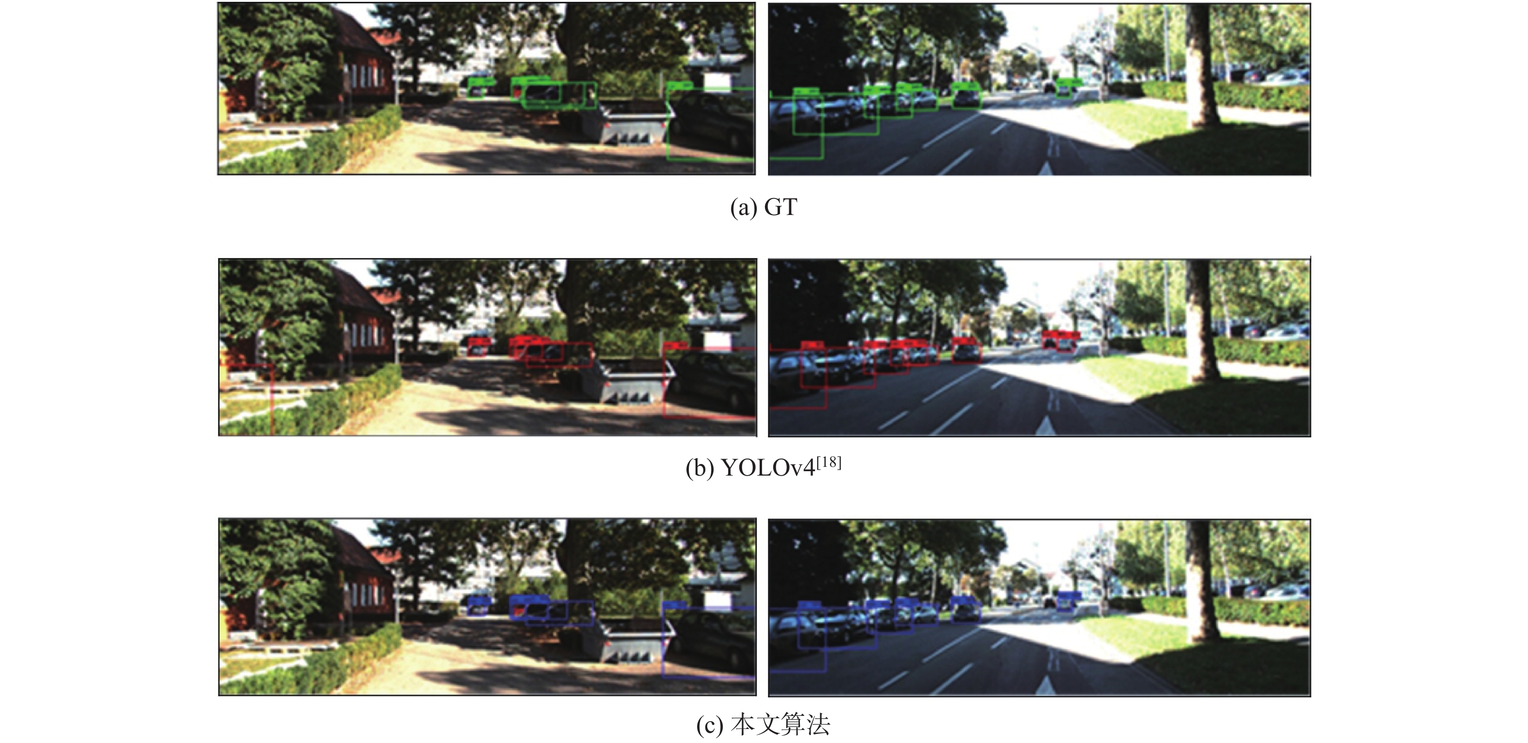 算法 骨干网络 图像大小/像素 mAP/% 帧率/(帧·s−1) Faster-RCNN [25] VGG-16 1000 ×60073.2 7 R-FCN [26] ResNet-101 1000 ×60080.5 9 CoupleNet [27] ResNet-101 1000 ×60082.7 8.2 SSD [28] VGG-16 512×512 76.8 19 DSSD513 [28] ResNet-101 513×513 81.5 5.5 YOLOv3 [29] DarkNet-53 544×544 79.3 26 RefineDet512 [30] VGG-16 512×512 81.8 24.1 ExtremeNet [32] Hourglass-104 512×512 79.3 3 FCOS [31] ResNet-50 800× 1333 81.1 10 CenterNet [32] ResNet-101 512×512 78.7 30 CenterNet-DHRNet [33] DHRNet 512×512 82.3 27.6 YOLOv4 [18] CSPDarkNet53 416×416 82.0 19.1 本文算法 CSPDarkNet53 416×416 83.7 16 表 6 本文算法和其他算法在KITTI上整体性能的对比