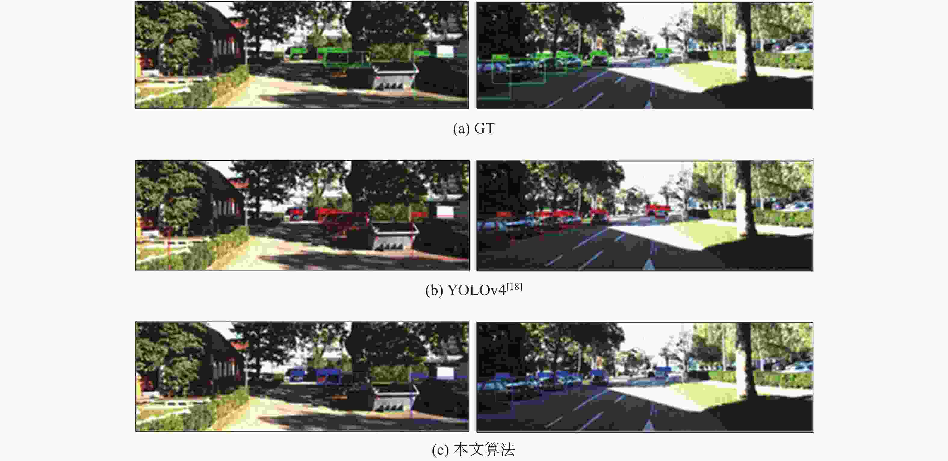 基准算法 AMCM ADT-NMS 阈值 mAP/% Recall/% MR−2/% YOLOv4 $ {N_{\mathrm{t}}} = 0.5 $ 82.00 95.7 14.7 √ $ {N_{\mathrm{t}}} = 0.5{[{\alpha ^2} + {({N^\beta } - 1)^2}]^{1/2}} $ 82.15 95.7 14.3 √ $ {N_{\mathrm{t}}} = \max ({d_{\mathrm{S}}},{d_{\mathrm{M}}},{d_{\mathrm{L}}}) $ 82.70 95.5 14.4 √ √ $ {N_{\mathrm{t}}} = \max ({d_{\mathrm{S}}},{d_{\mathrm{M}}},{d_{\mathrm{L}}}) $ 83.70 96.6 13.7 表 4 ADT-NMS在KITTI上的有效性分析