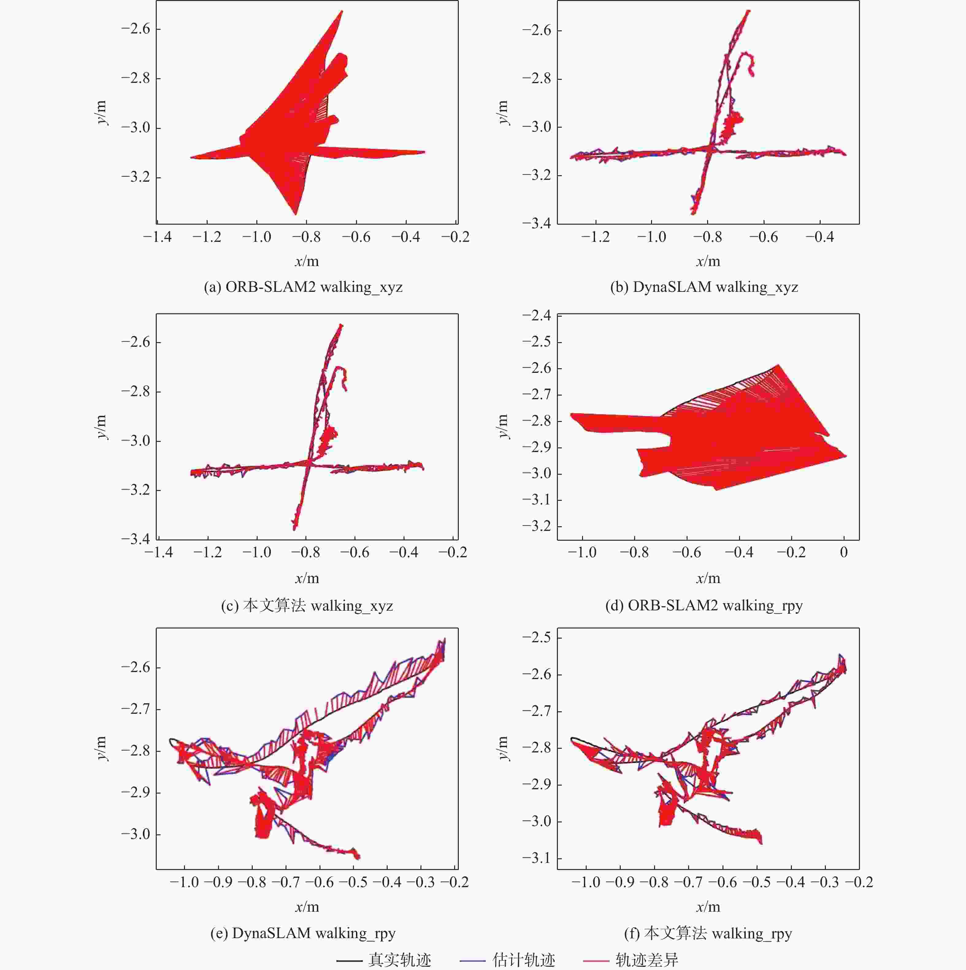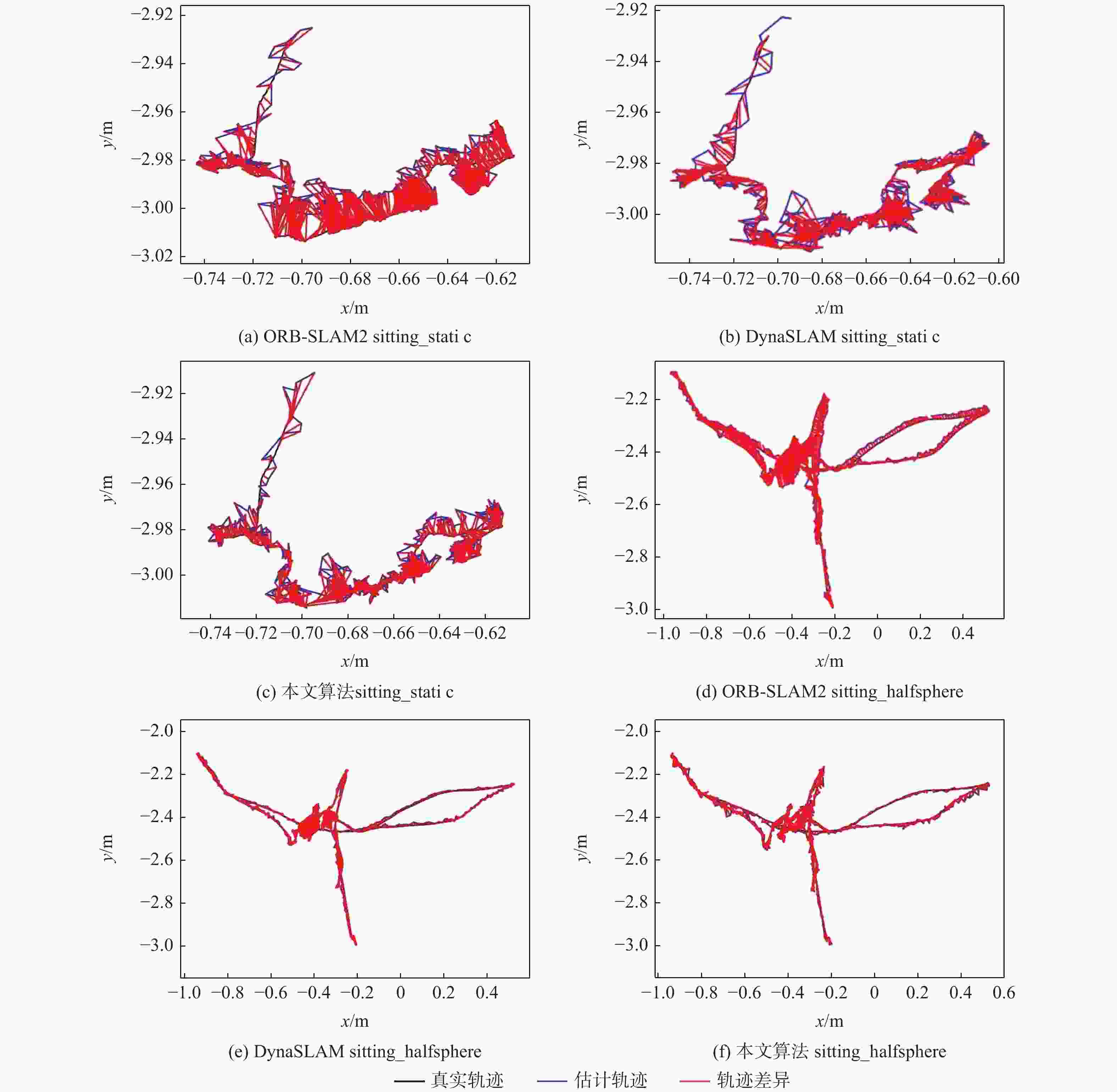数据集名称 ORB-SLAM2[8] YOLOv3-SLAM[29] YOLOv4-SLAM[30] DynaSLAM[17] 本文算法 fr3_sitting_static 0.005 814 0.006 678 0.006 538 0.006 379 0.006 153 fr3_sitting_xyz 0.011 067 0.012 211 0.012 060 0.012 741 0.011 950 fr3_sitting_halfsphere 0.011 109 0.028 343 0.030 124 0.018 423 0.025 955 fr3_sitting_rpy 0.016 804 0.016 104 0.016 180 0.020 151 0.016 260 fr3_walking_static 0.025 154 0.009 937 0.009 911 0.008 539 0.009 858 fr3_walking_xyz 0.032 623 0.015 785 0.015 911 0.014 958 0.015 203 fr3_walking_halfsphere 0.068 258 0.016 998 0.017 734 0.015 907 0.016 233 fr3_walking_rpy 0.029 868 0.022 164 0.022 131 0.024 993 0.022 125 -