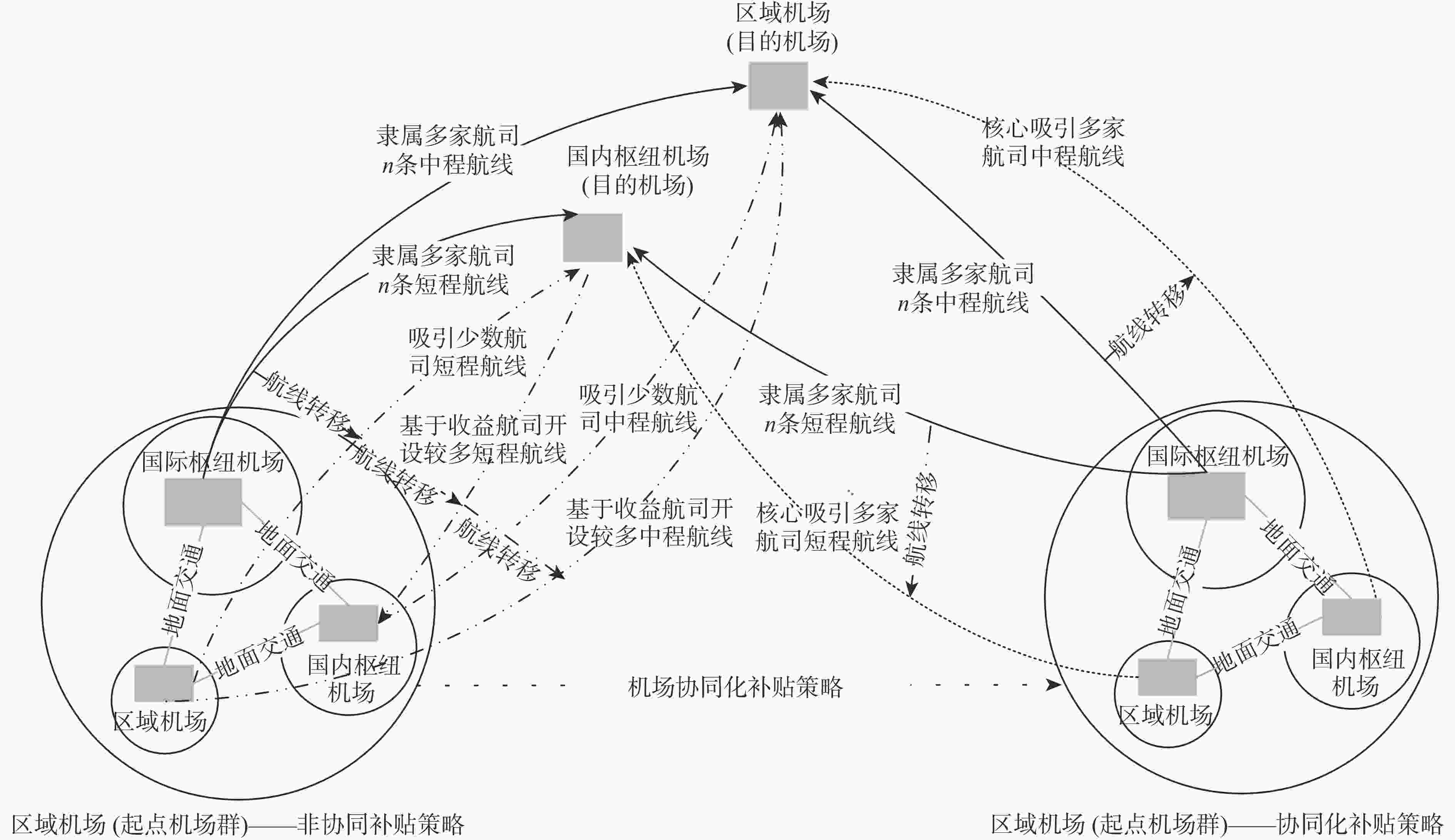 为实现区域内多机场基于差异化定位的高质量协同发展,研究机场差异化补贴策略对多机场航线网络演化影响,进而确定最佳补贴策略。基于旅客、航司、机场间的竞争博弈关系,构建了双层演化博弈模型。在上层博弈模型中,考虑旅客自学能力对票价的影响,构建融合自学习机制的Logit旅客选择模型,利用Hotelling定价模型分析同一航线航司间票价竞争对旅客选择行为的影响,进而确定在竞争条件下航司最佳定价策略;在下层博弈模型中,基于复制动态方程分析各机场补贴与航司间竞争性选择航线优化过程,确定机场间协同补贴策略与航线网络协同效果。结果表明:对于转移航线的航司,吸引“渗流”旅客的优势票价折扣区间为0.6~0.75;同航线竞争的航司票价折扣集中在0.6~0.85之间,可避免出现低价竞争带来的收益共损;通过机场差异化补贴实现航线网络优化,不同机场均存在基于差异化功能定位的最佳补贴区间。