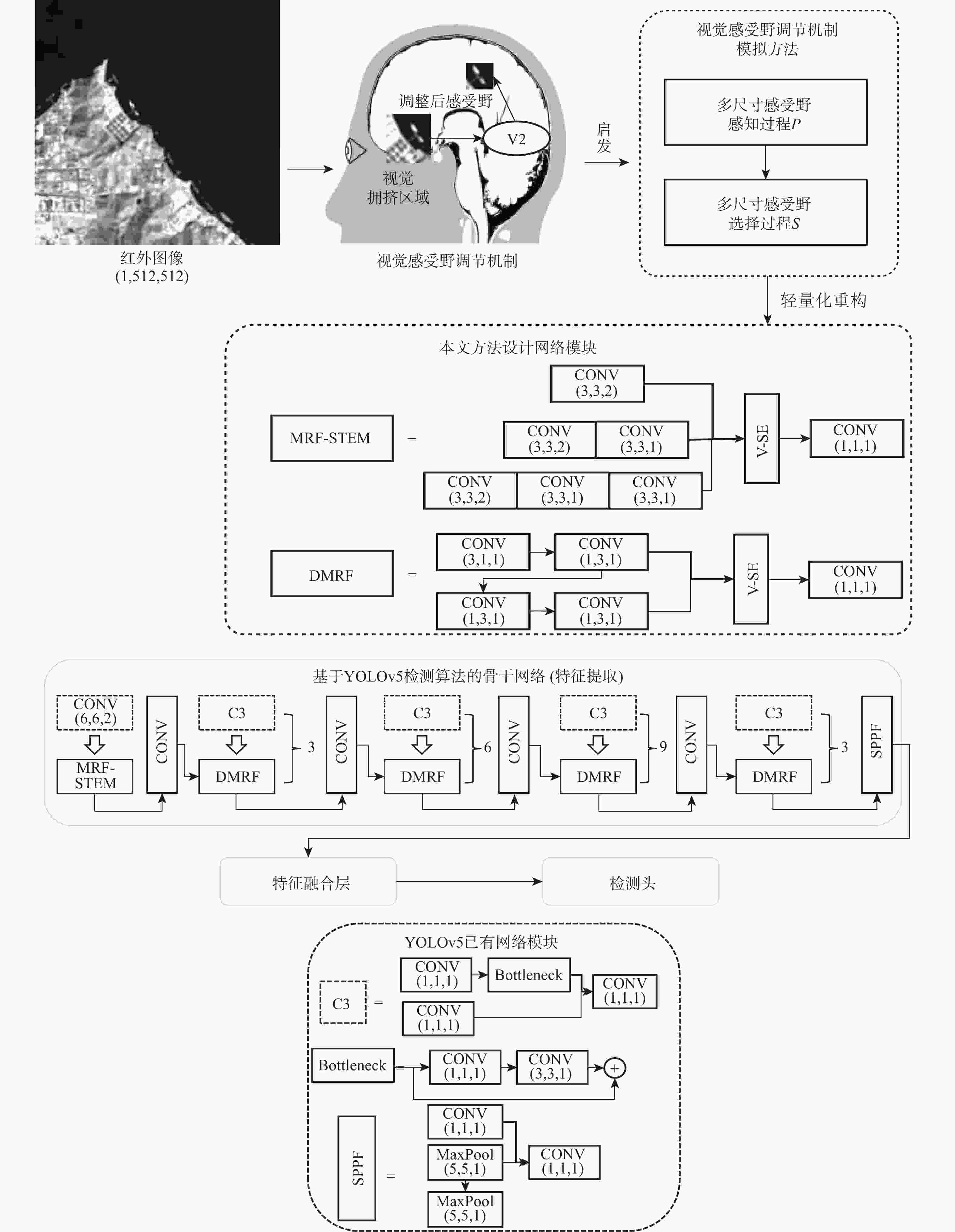 Abstract:A lightweight neural network design method is proposed to efficiently represent small ships in infrared remote sensing images. To improve the representation effect of infrared dim and small targets, a method for simulating the visual receptive field adjustment mechanism that incorporates multi-scale receptive field perception and selection processes is proposed. This method is inspired by the visual attention-driven receptive field adjustment mechanism. A lightweight feature selection operator is devised to enhance the receptive field selection, and feature reuse and convolution kernel decomposition are used to optimize the multi-scale receptive field perception process in order to further increase efficiency. Experimental results on an infrared dim and small ship detection dataset show that the network detection accuracy increased by 2%, with a reduction of 2.3×106 parameters and 9.1×109 computations compared to general lightweight networks. In complex scenarios with similar ground interference, this method effectively reduces false alarms and suppresses missed detections.