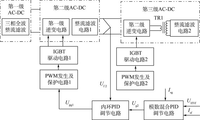 In order to enhance the stability and reliability of electron beam source system and improve the machining quality of electron beam, the topology circuit of AC-DC-AC-DC-AC-DC, new power transformer, high voltage pulse detection technology, optimized feedback control technology of electron beam and closed-loop control technology of filament current are introduced to optimize high voltage power source, bias voltage power source and filament power source. The inverter power supply, 150 kV/30 kW EB gun, vacuum system and others control system were integrated to establish a set of electron beam system. The high voltage, maximal electron beam output, and the influence of bias voltage and filament current on beam output are tested. The results of a series of tests show that the high voltage output of the inverter power supply has a fine linearity, and the maximum beam output is up to 200 mA at the high voltage output up to-150 kV. At given high voltage and current of filament, the electron beam will increase with the decrease of bias voltage. When the high voltage and bias voltage are given changeless, the electron beam output experiences non-beam phase, linear increasable phase and steady changeless phase with the increase of filament current.