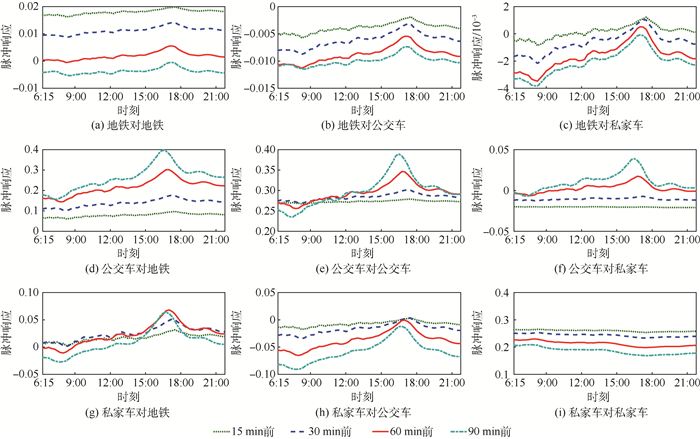 Under the condition of multimodal travel choices in large cities, there is a close relationship of traffic demands among subway, buses and private cars. In order to explore the coupling relationship and time-varying feature among multimodal traffic demands, with road congestion index representing the traffic demands of private cars, this paper adopts the time-varying parameter vector autoregressive (TVP-VAR) model to analyze one-month travel demands of subway, buses and road congestion index on weekdays. The empirical results of two traffic zones demonstrate that:Depending on different land use types, the relationship among subway demand, bus demand and private car demand does not significantly change in trend, but varies in time scale; In urban traffic zones, there is an interactive relationship among traffic demands of subway, buses and private cars. As subway demand increases, less passengers will switch to buses. When bus demand increases, subway demand will increase correspondingly. The increase of private car travel demand will increase the subway travel demand but reduce the bus travel demand. The research is helpful to understand the coupling relationship among different travel modes in our country at the present stage, and thus to better cope with the issue of urban traffic congestion.