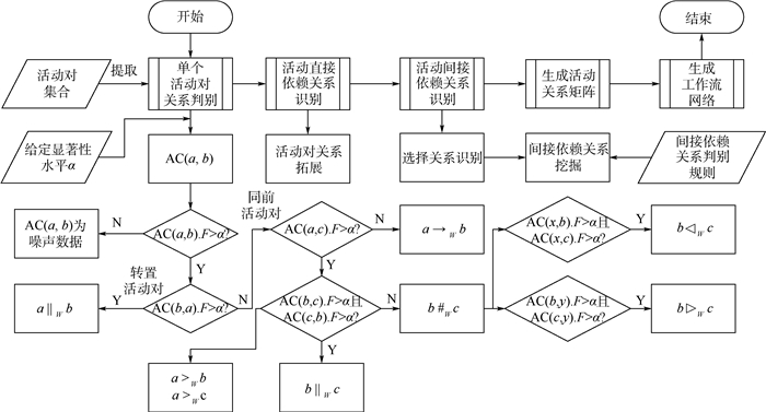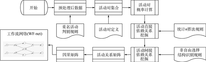 Workflow technology is widely used in business process management. However, there are still many problems during the execution of business process because of the imperfect workflow model. Process mining is the most useful tool of workflow modeling, which can obtain objective and valuable information from event logs and build process model. Nevertheless, the existing process mining algorithms still have some problems, such as low accuracy, long operation time and overfitting, which will decreace the accuracy of the workflow model. This paper proposed a new process mining algorithm based on statistical α-algorithm, which can not only ensure the accuracy and suitable fitness, but also decrease the operation time. First, cognominal activity identification rules were proposed to be the pre-treated process of process mining, which could improve the accuracy of algorithm. Second, statistical α-algorithm was proposed as the core algorithm of process mining to eliminate the influence of noise in event logs. Moreover, a new algorithm was proposed to identify non-free-choice constructs, which improved the robustness and accuracy of the algorithm. The accuracy and efficiency of the algorithm are verified by simulation and real case.