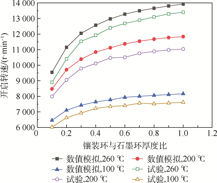 This study investigates the inlaid floating ring seal with high-speed gas films in aeroengines, focusing on the opening performance of the seal with different structural parameters, starting modes, and material combinations. The solid domain model and the gas film fluid domain numerical analysis model of the inlay ring-graphite ring-runway are established, and the working gas film thickness and the pressure distribution of the gas film flow field are obtained. By calculating the seal force, the seal opening performance parameters, such as buoyancy, closing force and opening speed, are obtained. This study analyzes the effects of many factors on seal opening speed, such as the inlay-graphite ring thickness ratio and width ratio, and material matchings between the inlay and graphite rings and between the inlay ring and runway.A floating ring seal test bench and a floating ring displacement monitoring system are built, and the numerical simulation results are verified by experiments. Results show that the inlaid structure of the floating ring can effectively improve the sealing failure caused by the decrease of the gap between the graphite ring and runway when temperature rises. The material of the insert ring is a sensitive parameter, which affects the opening performance of seals. This performance decreases rapidly with the increase of the linear expansion coefficient of the material. The material matching between the inlay ring and runway is an important factor for the opening performance. When the inlay ring and runway have the same material, the graphite ring and runway are in a state with a "constant gap", and the opening performance of the seal is more stable at complex temperatures. Results also show that start-up mode has great influence on the opening performance of seals, and that this performance is best when the engine is started by increasing the speed to the working speed and then pressurized. Therefore, floating ring seals should avoid adjusting operating parameters for a long time with higher pressure and speed. The results provide a basis for structural design, material selection and system design of the inlaid floating ring seal for aircraft engines.
