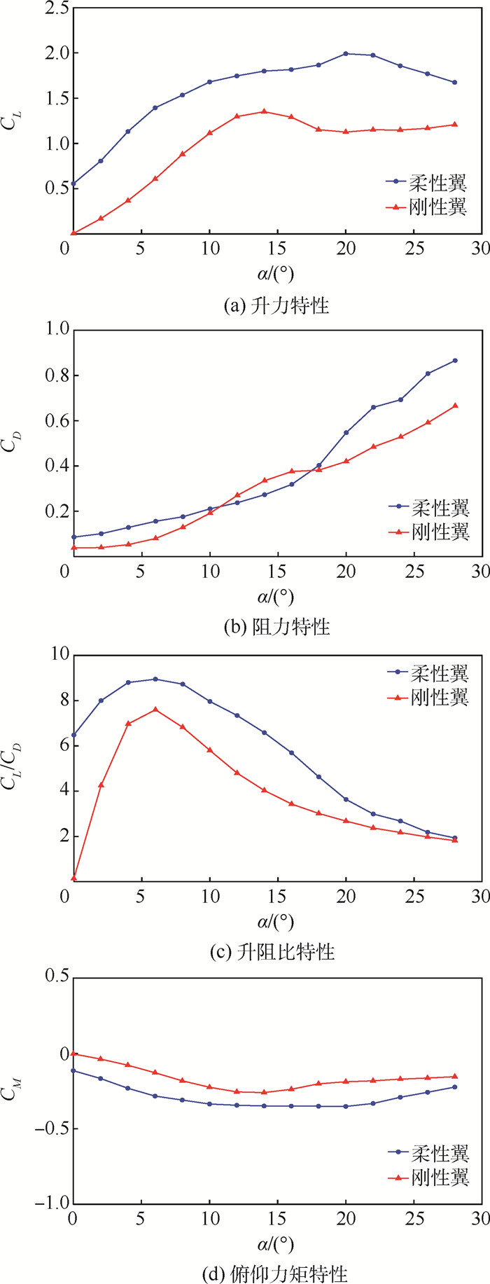 Micro air vehicles (MAV) have wide appications in both miltary and civilian fields, and flexible membrane wings are an effective method to improve the aerodynamic of MAV. In order to better control the flexible wing, the vibration and deformation characteristics of the flexible membrane wing and their impact on aerodynamic force are measured synchronously. Compared with the rigid wing, for the flexible membrane wing, the stall angle of attack is delayed by 6°, the maximum lift coefficient is increased by 47.4%, and the lift-drag ratio is increased by 17.8%. In addition to the characteristics of large amplitude and small static deformation at α=0°~2°, the amplitude of the periodic vibration of the flexible membrane wing undergoes a transition from no obvious crest, three crests to one crest as the angle of attack increases. When the lift coefficient is maximum, the corresponding membrane deformation and vibration amplitude both reach their maxima. Besides, the chordwise position of the maximum deformation changes with the angle of attack, which determines the pitching moment characteristics. Based on these results, an active control method of improving aerodynamic performance by applying deformation and vibration excitation with specific frequency is proposed.