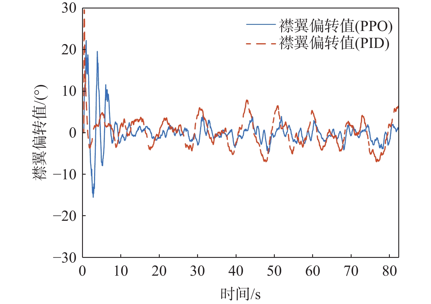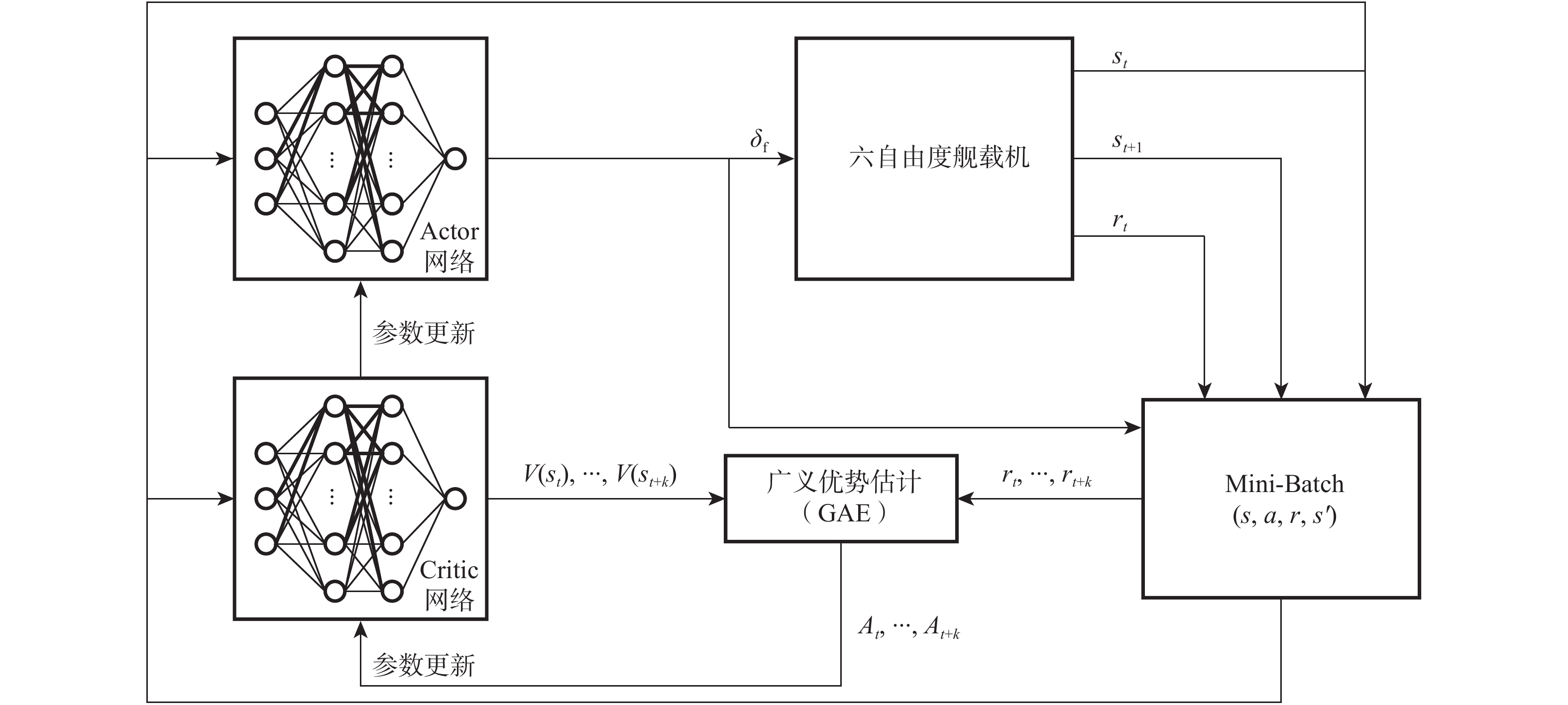 The direct lift control method of automatic landing based on Proximal Policy Optimization (PPO) algorithm was proposed to solve the problem that it is easy to touch ship due to disturbance of deck movement and carrier air wake during automatic landing of carrier aircraft. The PPO controller takes six state variables of pitch angle, height, flight path angle, pitch angle rate, height error and flight path angle rate as input and output as flap deflection angle, realizing the rapid response of carrier aircraft in different landing states of flight path angle. Compared with traditional PID controller, the Actor-Critic network in PPO controller greatly improves the calculation efficiency of control quantity, and also reduces the difficulty of parameter optimization. The simulation experiment in this paper is based on the dynamics/kinematics model of F/A-18 aircraft constructed in Matlab/Simulink. The intensive learning and training environment built on PyCharm platform is used to realize the data interaction between the two platforms through user datagram protocol (UDP) communication. The simulation results show that the proposed method has the characteristics of fast response speed and small dynamic error, and can stabilize the landing height error within ±0.2 m, with high control accuracy.