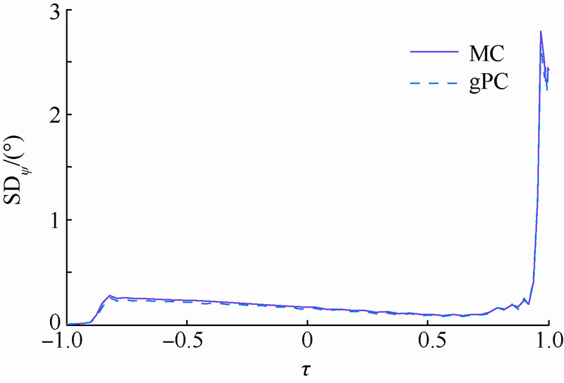 考虑到气动参数是通过特定马赫数下进行插值拟合得到的,不可避免地存在着建模误差,本节考虑ρ0,CL和CD的随机干扰服从均值为零,方差分别为0.05,0.04和0.04的正态分布.同样选取随机变量的配点数目N1=N2=N3=7,MC方法取点300个.