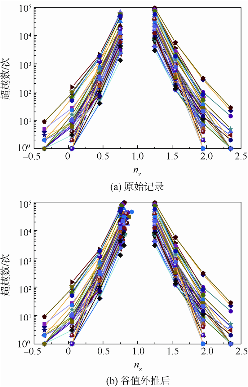 文献[18]指出澳大利亚编号分别为10131,10132,10444和10445的4架飞机使用情况偏严重,认为使用情况不同.将上述4架飞机删除后,对剩余的59架飞机的载荷因子-超越数曲线族进行分析,发现非洲编号为10193、欧洲编号为10116以及澳大利亚编号为10135的3架飞机平均每次飞行所有测量载荷因子的超越数增量均小于1,使用情况偏轻,有理由认为上述7架飞机的使用情况与其他飞机不同,从而删除上述7架飞机的载荷数据.对剩余56架飞机的载荷-超越数数据、飞行时间和飞行次数进行检查后,将56架飞机作为按相同使用情况使用的同类飞机,认为其载荷因子-超越数数据属于同一母体. 1.2 外推峰谷值累积超越数