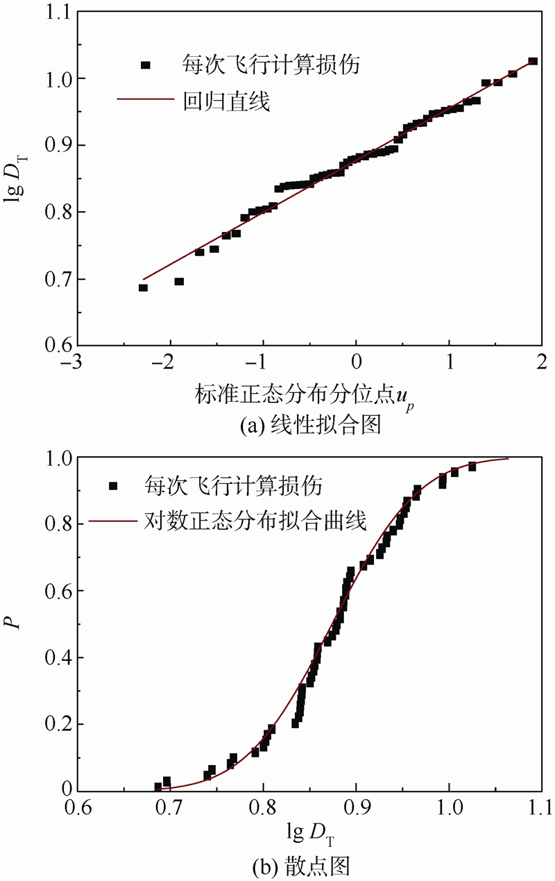 机群地-空-地循环当量损伤线性拟合图与散点分布图分别见图 4.同理,取对数正态分布为最佳分布.
