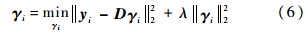 本文在考虑图像块的位置信息和遮挡因素的基础上,提出了一种生成式模型.对于所有的候选样本利用分块的方法形成N个图像块,如图 1所示.本文在实验部分将每个图像块变成一个向量Yi∈Rd×1,表示图像块的大小.利用L2范数最小化来求解每个图像块的系数向量: