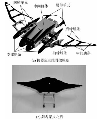 机器鱼三维骨架结构如图 1(a)所示,主要包括3个部分:中间机体、胸鳍单元和尾部单元.机器鱼骨架附着蒙皮后如图 1(b)所示,机器鱼具有扁平外形结构,可以在水平方向上增加与水流的接触面积,使机器鱼具备较好的俯仰稳定性.两侧胸鳍单元由主动变形机构和被动变形骨架构成.仿生胸鳍的主动变形机构为两自由度空间并联机构,由两组舵机驱动.被动变形骨架根据鲼形目鱼类的胸鳍生物学构造进行设计,主要包括前缘鳍条、中间弦向肋条和后缘鳍条.前缘鳍条沿翼尖方向逐渐变窄,以增加仿生胸鳍的展向被动变形能力.后缘鳍条柔性小于前缘鳍条,以增加仿生胸鳍的弦向变形能力.中间弦向肋条截面采用NACA0012标准翼型,具有较强的刚度,起连接前后缘鳍条和支撑蒙皮的作用,同时增加胸鳍的弦向刚度,以模仿鲼形目鱼类胸鳍的钙化区域.