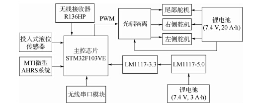 控制系统硬件部分主要由主控制器、通信系统、传感器信号采集系统和供电系统4个部分组成,如图 2所示.机器鱼具有2种工作模式:遥控控制方式、定深游动方式.在遥控工作模式下,无线接收器可接收遥控器发来的信号,经主控制器处理后得到胸鳍摆动频率、幅度、相差、尾舵控制信息,控制机器鱼游动.在定深模式下,主控制器和上位机通过无线串口模块进行通信,获得目标深度指令,主控制器通过采集传感器信号,并利用定深控制算法,输出PWM波控制6组舵机,实现胸鳍单元和尾部单元的摆动,通过控制尾部单元的摆动角度,实现机器鱼的俯仰运动,进而实现机器鱼的定深控制.