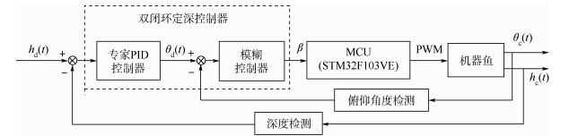 基于以上分析,构建机器鱼双闭环定深控制系统如图 3所示.其中,基于专家PID的控制器构成控制外环,用于根据深度误差生成期望的俯仰角度信号.模糊控制器构成控制内环,用于根据给定俯仰角度实时调整机器鱼的俯仰姿态.同时能够减小环境扰动对机器鱼到达目标深度后稳态游动的影响.
