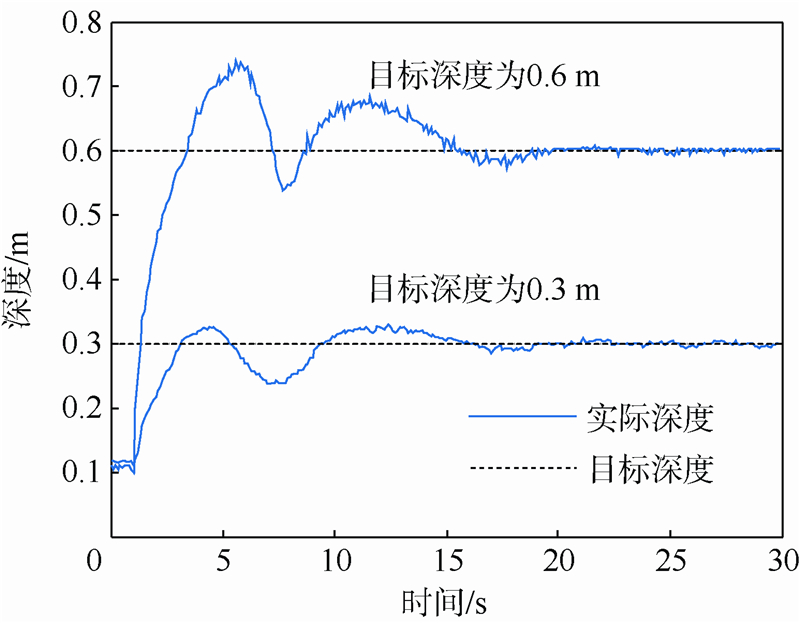 3) 通过实验发现,目标深度不同时,机器鱼的俯仰角度变化范围随着目标深度的增加而增大.说明在本文建立的定深控制系统下,机器鱼能够在初始运动时尽快接近目标深度,以减少达到稳定游动状态的时间.