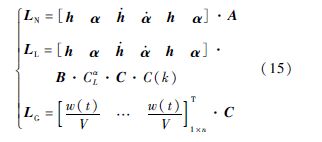 设飞机总质量为m,绕质心的俯仰惯量为I,h和L均向上为正,俯仰自由度α和绕质心的俯仰力矩M均抬头为正,飞机的运动状态可由二阶刚体模态(h和α)以及前p阶弹性模态表示,模态坐标系下弹性飞机的运动方程[11]为