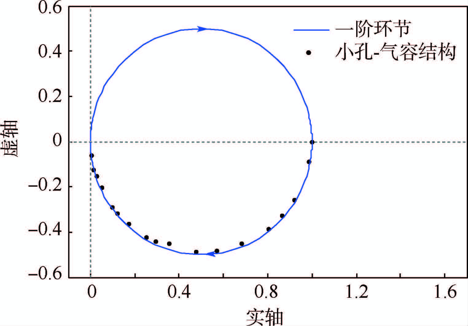 | 图 7 小孔-气容结构充放气的幅相特性与一节环节的幅相特性 Fig. 7 Amplitude-phase characteristics of charge and discharge of hole-container structure and amplitude-phase characteristics of first-order element |
