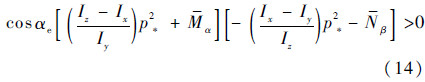 忽略阻尼项Mq、Nr,则特征方程可简化为s4+bs2+d=0,易知急滚稳定条件为b>0且d>0。通常情况下由于此类飞行器具有偏航静稳定性,并且在再入过程中高马赫数情况下具有纵向静稳定性,因此能保证b>0。令d>0得到定常滚转的必要条件为