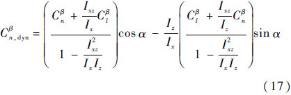 通常飞行器的横侧向运动具有3个模态:荷兰滚模态、滚转收敛模态和螺旋模态。其中荷兰滚模态是滚转运动与航向运动的耦合形成的震荡模态,在大攻角时使用动态偏航稳定性导数Cβn,dyn表征航向动态稳定性(即荷兰滚稳定性),Cβn,dyn>0则具有航向动态稳定性。Cβn,dyn的计算公式为
