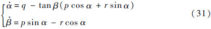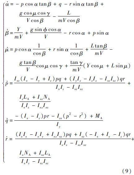 当飞行器做快速大滚转机动并且飞行速度远大于重力加速度(即V》g)时,式(9)中攻角动态方程中的重力与升力项(cosμcosγ-L/mg)g/(Vcosβ)、侧滑角动态方程中的重力项gsinΦcosα/V数值很小,可以忽略不计,与此同时忽略侧力的影响,得到如下简化方程: