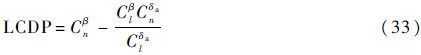 当体襟翼差动产生副翼偏角操纵滚转的同时会产生不利偏航运动,从而引起副翼控制滚转反极性现象:操纵副翼绕机体轴左滚,飞行器却是绕机体轴右滚。通常使用横向控制偏离判据 (Lateral Control Departure Parameter,LCDP)预测副翼操纵性能[16, 17]: