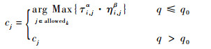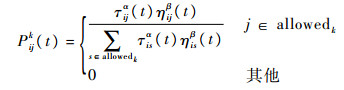 式中:q为随机数,取值范围为[0,1];q0比例可变,范围在[0,1]之间。人工蚁在运动过程中会积累信息,这种积累和启发式信息对于人工蚁的路径选择具有一定的作用,设置参数α和β以表征这种作用。第k只人工蚁t时刻在构造图中从任务节点ci运动到节点cj的概率用Pijk(t)表示;allowedk为人工蚁可选边的集合。人工蚁之前的选择和知识会对随机过程有一定的影响,因而其路径选择是一个双重决策的过程。q0表示路径选择受到知识的影响,q0越小,则随机性更强,收敛性越差,但是最优解的获取时间越短。