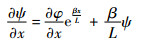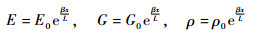 1 理论推导 1.1 基本方程考虑材料沿轴向指数变化的功能梯度Timoshenko梁,梁的长度为L,梁的截面惯性矩为I,面积为A,材料的弹性模量、剪切模量和密度沿梁的轴向方向服从指数的变化规律[15-16],如图 1所示。为了简化模型,令