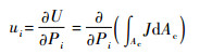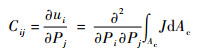 式中:U为裂纹区域的应变能;Ac为裂纹区域;ui为沿力Pi方向裂纹所造成的附加位移;J为应变能密度函数[24],即