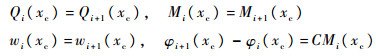 裂纹两端的纵向位移、弯矩和剪力具有连续性,但是裂纹两端的转角却不存在连续性,本文采用扭转弹簧来模拟裂纹对结构局部柔度的贡献,裂纹所在位置的坐标为xc,因此有