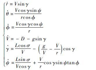 式中:r、θ、Φ、V、γ、ψ分别为飞行器质心到地心的距离、经度、纬度、飞行器相对地球速度、弹道倾角及航向角;D、L分别为飞行器阻力加速度和升力加速度;σ为飞行倾侧角;g为引力加速度。