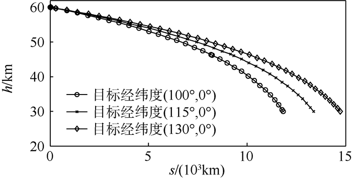 综上可得,利用本文的解析解能够规划出符合约束要求的滑翔弹道。在普通台式机上,在无特定初值的条件下,规划1条机动弹道的时间小于0.3 s。