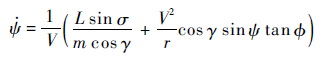 式中:h、s、θ、ø、ψ和V分别为当地地心坐标系下的高度、射程、经度、纬度、弹道偏角和飞行器与地球的相对速度;γ为弹道倾角;r为地心与飞行器的距离,r=R0+h,R0为地球半径;m为飞行器的质量;σ为倾侧角;g为当地重力加速度,g=μ/r2,μ为地球的重力常数;L和D分别为升力及阻力,表达式为