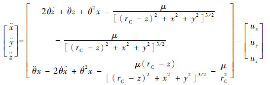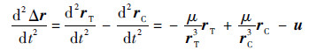 式中: Δr为相对位置矢量;rC为追踪航天器到地球中心的矢量;rT 为目标航天器到地球中心的矢量;μ为地球引力常数;u为追踪航天器通过有限推力产生的加速度。