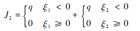 障碍物规避采用罚函数法处理,定义为距离项J2。考虑到当ξ1 <0时,追踪航天器与障碍物会发生碰撞,即使ξ1非常接近0也会发生碰撞;同时,当ξ1≥0时,不会发生碰撞,即使ξ1非常接近0也不会发生碰撞。所以,规避障碍物的罚函数采用阶跃函数,当ξ1 <0会发生碰撞时,罚函数取值为q,当 ξ1≥0不会发生碰撞时,罚函数取值为0。对追踪航天器规避目标航天器时采用相同的函数形式,当ξ2 <0会发生碰撞时,罚函数取值为q,当ξ2≥0不会发生碰撞时,罚函数取值为0。距离项J2表达式为