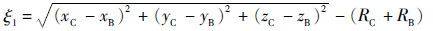 逼近过程中,要求追踪航天器质心(xC,yC,zC)与障碍物质心(xB,yB,zB)的距离大于追踪航天器和障碍物的包络半径之和,定义距离与包络半径之和的差值ξ1如下: