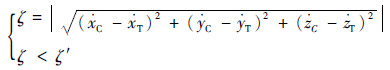 同时,在逼近非合作目标过程中,追踪航天器质心(xC,yC,zC)与目标航天器质心(xT,yT,zT)的距离大于追踪航天器包络半径RC 和目标航天器包络半径RT之和,定义距离与包络半径之和的差值为ξ2。