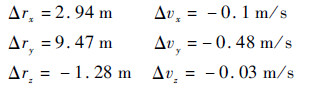 假设追踪航天器和目标航天器的轨道六要素如表 2所示。在t=0时刻两者相距10 m,并有相对速度。建立轨道坐标系So,原点在追踪航天器质心,z轴指向地球,x轴沿速度方向,y轴符合右手定则,即沿轨道面负法向。在该坐标系下,目标航天器相对于追踪航天器的相对位置和相对速度分别为