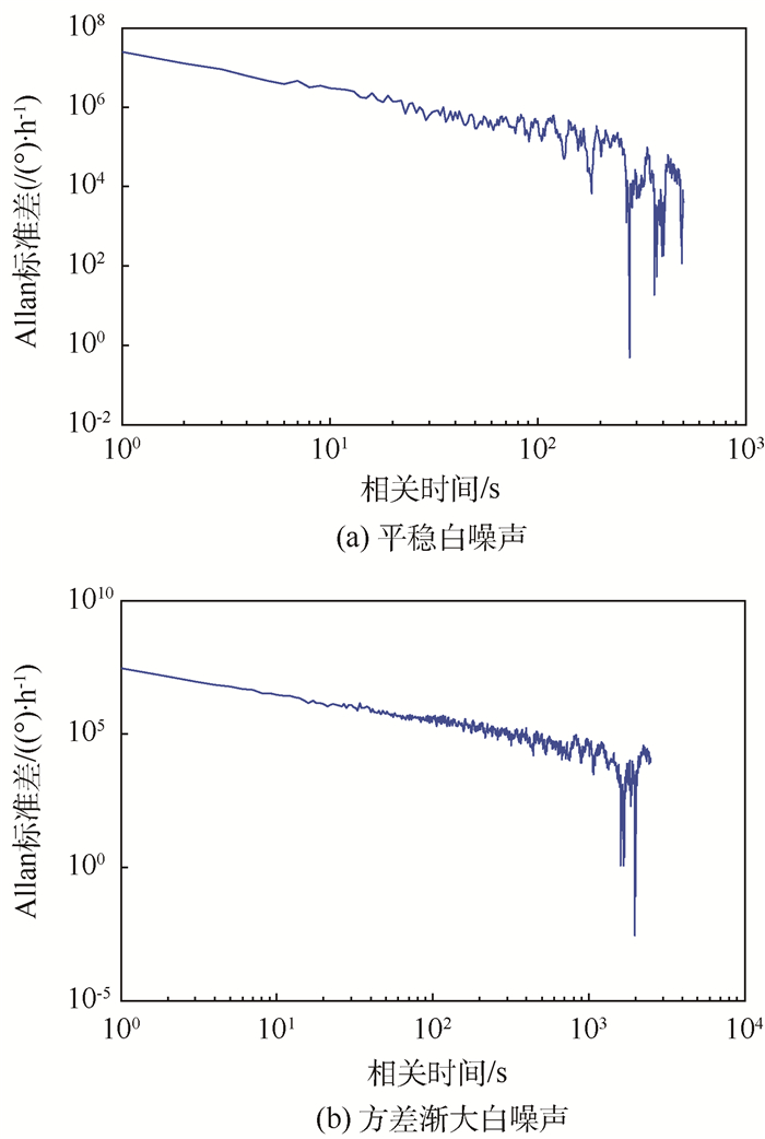 1.3 Allan方差法的缺陷为了找出Allan方差的缺陷,分别仿真出平稳白噪声和方差渐大的白噪声如图 1所示,然后使用Allan方差法进行分析,分析结果如图 2所示。