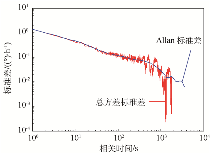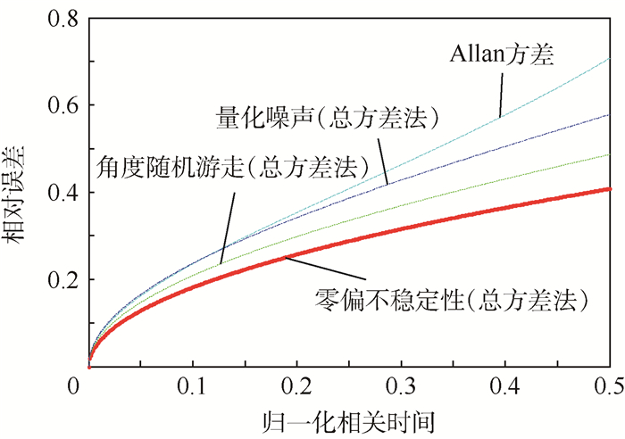 从图 3中可以看出,在相关时间较小的情况下,Allan方差和总方差法的相对误差相差不大;但是在相关时间较大的情况下,总方差法的相对误差比Allan方差法的相对误差小很多;当归一化相关时间为0.5时(即在Allan方差法中将所有数据分为2组),Allan方差估计值的相对误差为70.71%,量化噪声的总方差估计值相对误差为57.81%,角度随机游走的总方差估计值相对误差为40.82%,零偏不稳定性的总方差估计值相对误差为48.63%,说明了当归一化相关时间为0.5时,总方差法的估计值依然有效,其精度远远高于Allan方差法。